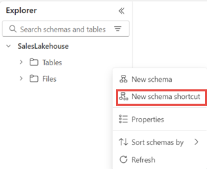 ถัดไป ให้สร้างทางลัดจากส่วน ตาราง เลือก ... ที่อยู่ถัดจากส่วนตาราง และเลือกทางลัด Schema ใหม่ จากนั้นเลือก Microsoft OneLake เลือก SalesLakehouse จากชนิดแหล่งข้อมูล ขยายส่วน ไฟล์ และเลือกโฟลเดอร์บทช่วยสอน และเลือก สร้าง คุณยังสามารถใช้ตัวเลือกอื่น ๆ เพื่อรับข้อมูลลงในเลคเฮ้าส์ได้
