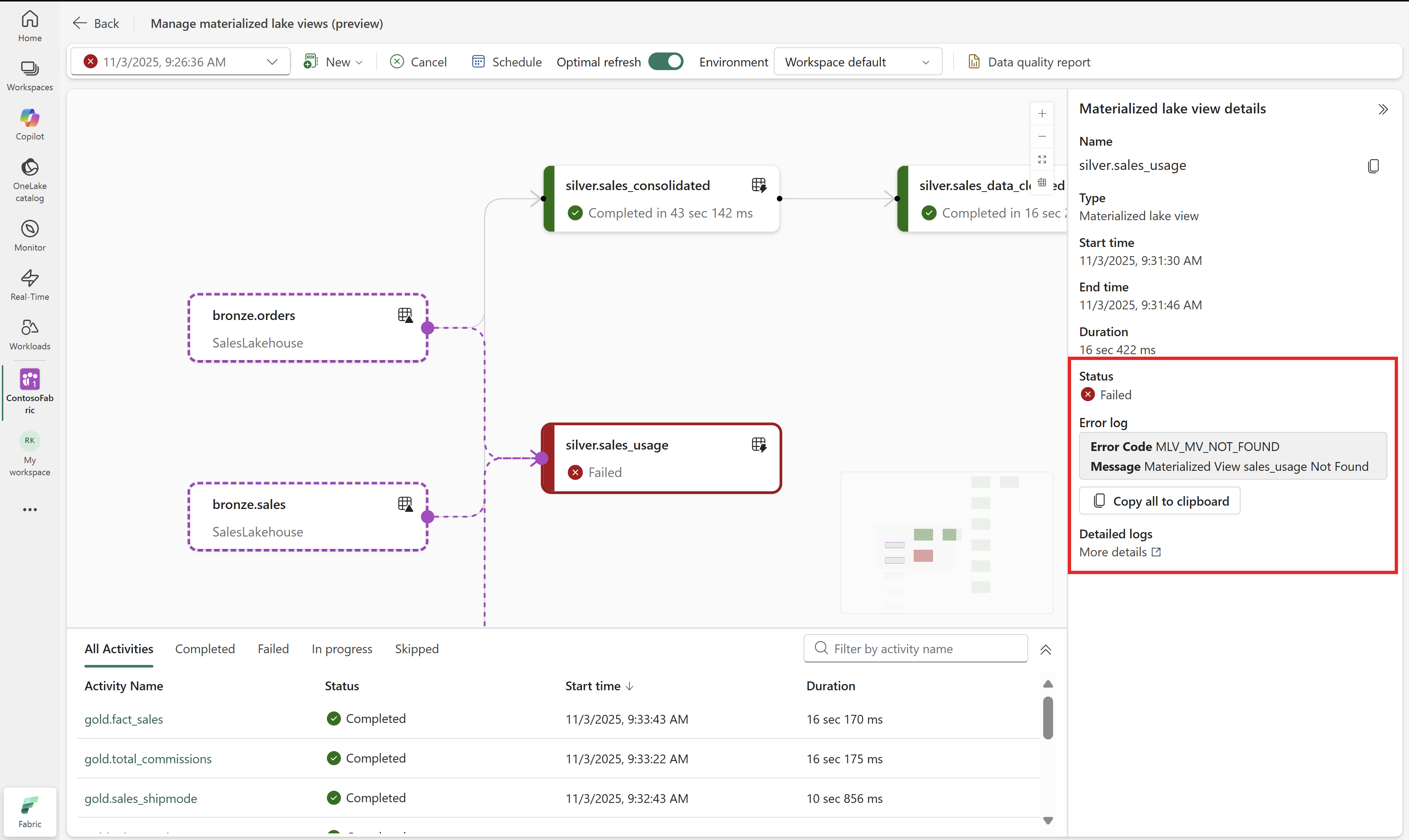 เลือกโหนดใด ๆ ในสายข้อมูลเพื่อดูรายละเอียดการดําเนินการโหนดและลิงก์ไปยังบันทึกรายละเอียด ถ้าสถานะโหนดเป็น ล้มเหลว ระบบจะแสดงข้อผิดพลาดด้วย
