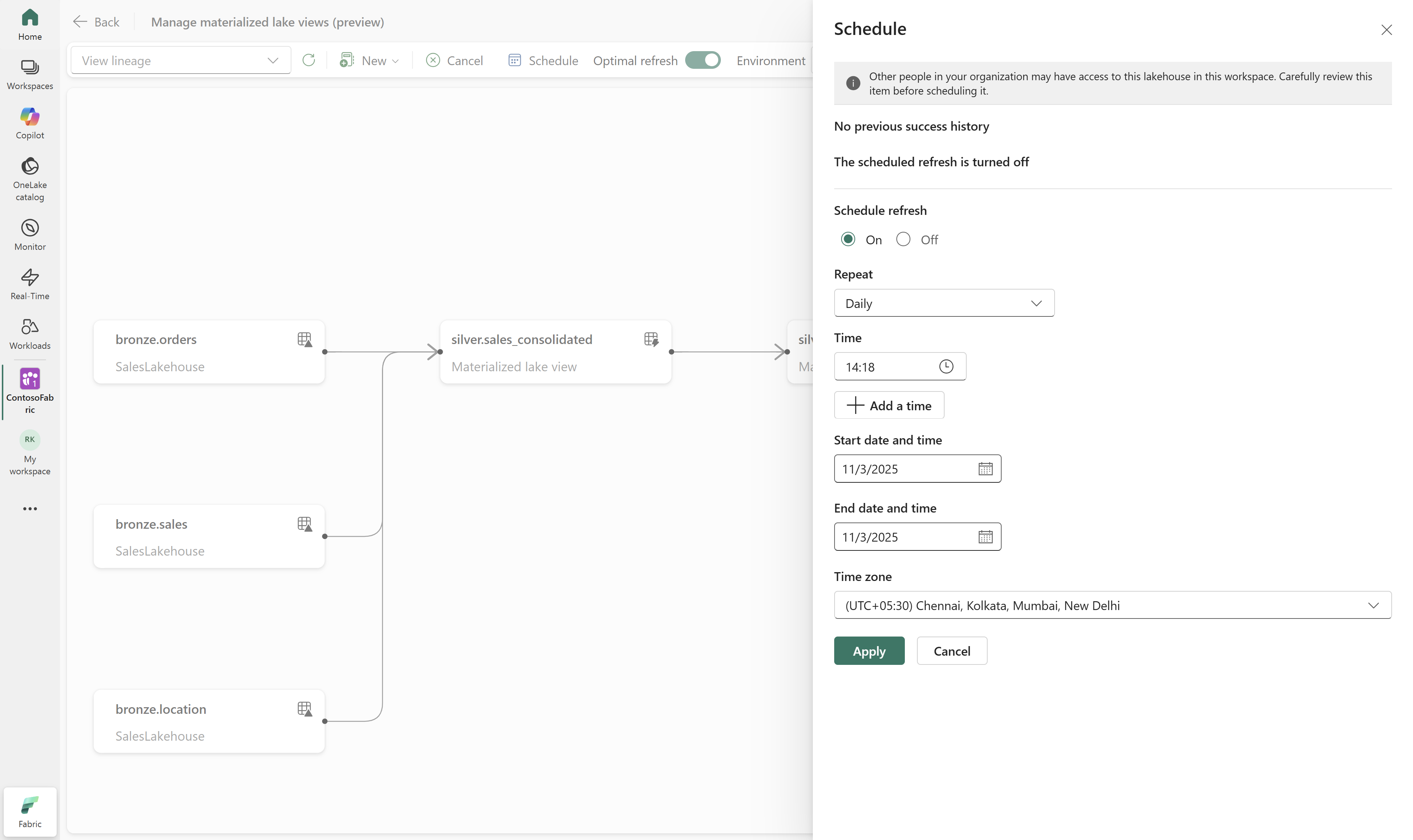 เมื่อสร้างมุมมองทะเลสาบที่เป็นรูปธรรมสําหรับชั้นสีเงินและสีทองแล้วให้ไปที่เลคเฮ้าส์และเลือก จัดการมุมมองทะเลสาบที่มีลักษณะเป็นรูปธรรม เพื่อดูมุมมองสายข้อมูล มันสร้างโดยอัตโนมัติขึ้นอยู่กับการขึ้นต่อกันมุมมองทะเลสาบที่ขึ้นต่อกันเป็นรูปธรรมแต่ละรูปแบบของสายข้อมูล