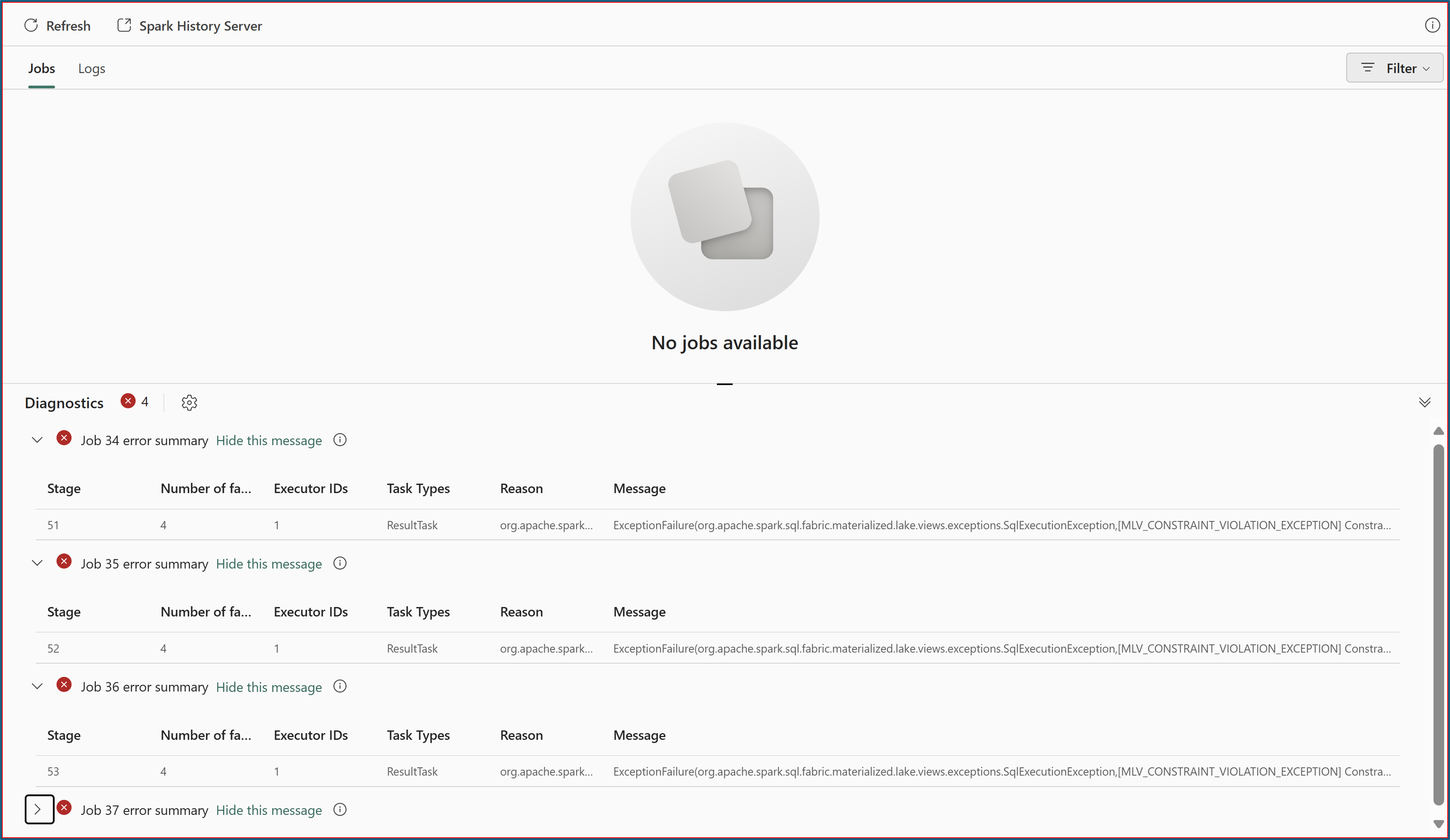 การเลือกลิงก์ บันทึกโดยละเอียด จะเปลี่ยนเส้นทางคุณไปยัง Monitor Hub จากตําแหน่งที่คุณสามารถเข้าถึงบันทึกข้อผิดพลาด Spark สําหรับการแก้ไขปัญหาเพิ่มเติมได้
