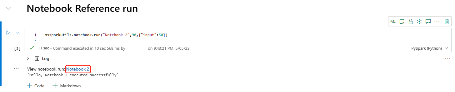 mssparkutils.notebook.run("Sample1", 90, {"input": 20 }, "fe0a6e2a-a909-4aa3-a698-0a651de790aa")