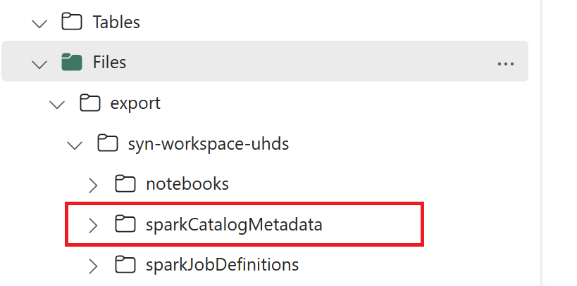 // Azure Synapse workspace config var SynapseWorkspaceName = "<synapse_workspace_name>" var DatabaseNames = "<db1_name>;<db2_name>" var SkipExportTablesWithUnrecognizedType:Boolean = false // Fabric config var WorkspaceId = "<workspace_id>" var LakehouseId = "<lakehouse_id>" var ExportFolderName = f"export/${SynapseWorkspaceName}/sparkCatalogMetadata" var OutputFolder = f"abfss://${WorkspaceId}@onelake.dfs.fabric.microsoft.com/${LakehouseId}/Files/${ExportFolderName}/"1.3) เรียกใช้คําสั่ง สมุดบันทึกทั้งหมดเพื่อส่งออกวัตถุแค็ตตาล็อกไปยัง OneLake เมื่อเซลล์เสร็จสมบูรณ์ โครงสร้างโฟลเดอร์นี้ภายใต้ไดเรกทอรีผลลัพธ์ระดับกลางจะถูกสร้างขึ้น