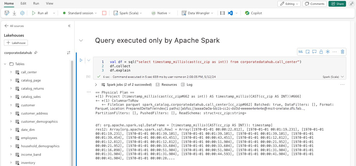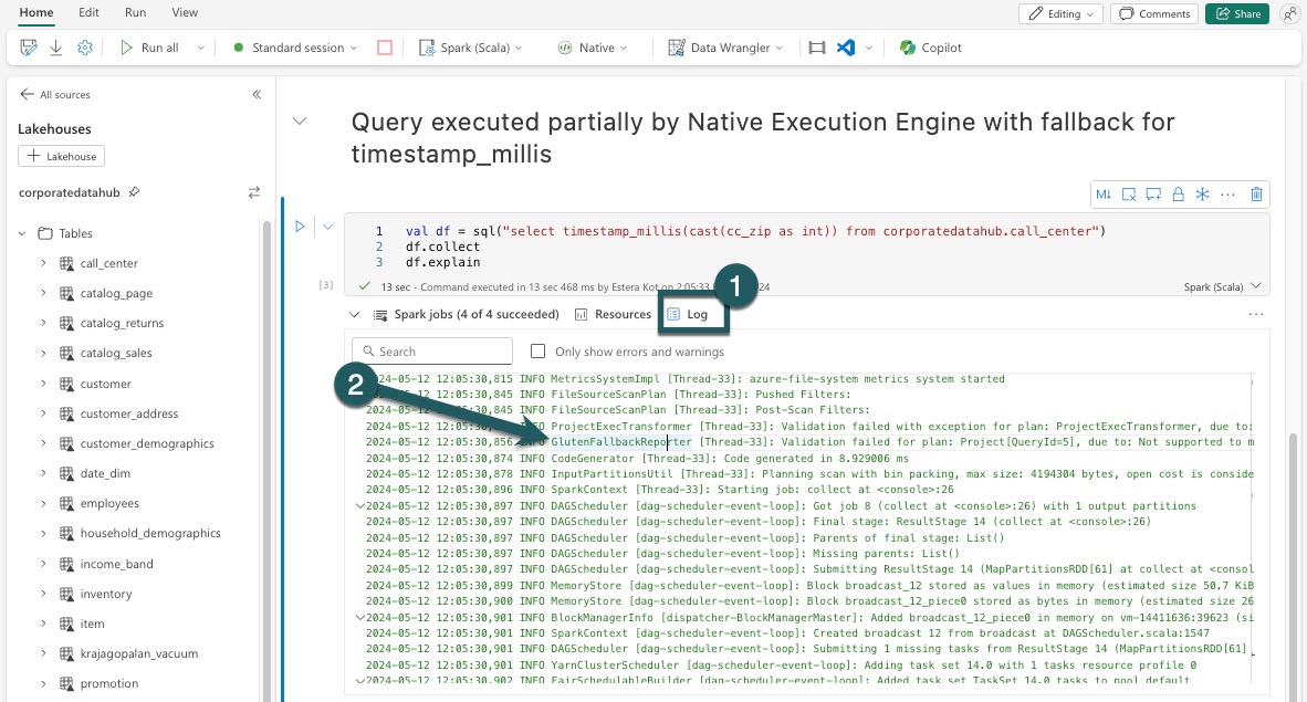 หลังจากดําเนินการคิวรีที่กลไกการดําเนินการดั้งเดิมถูกปิดใช้งาน คุณต้องเปิดใช้งานอีกครั้งสําหรับเซลล์ที่ตามมาโดยการตั้งค่า spark.native.enabled เป็น true ขั้นตอนนี้มีความจําเป็นเนื่องจาก Spark จะดําเนินการกับเซลล์โค้ดตามลําดับ