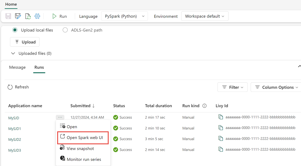 เข้าถึงเซิร์ฟเวอร์ประวัติ Spark UI หรือ Spark เพื่อค้นหาคิวรีที่คุณต้องการตรวจสอบ เมื่อต้องการเข้าถึง UI ของเว็บ Spark ให้นําทางไปยังข้อกําหนดงาน Spark ของคุณและเรียกใช้งาน จากแท็บ Runs เลือกแท็บ ... ถัดจาก ชื่อแอปพลิเคชันของ และเลือก เปิด UI ของเว็บ Spark คุณยังสามารถเข้าถึง Spark UI ได้จากแท็บ Monitor ในพื้นที่ทํางาน เลือกสมุดบันทึกหรือไปป์ไลน์ จากหน้าการตรวจสอบ มีลิงก์โดยตรงไปยัง Spark UI ของ สําหรับงานที่ใช้งานอยู่