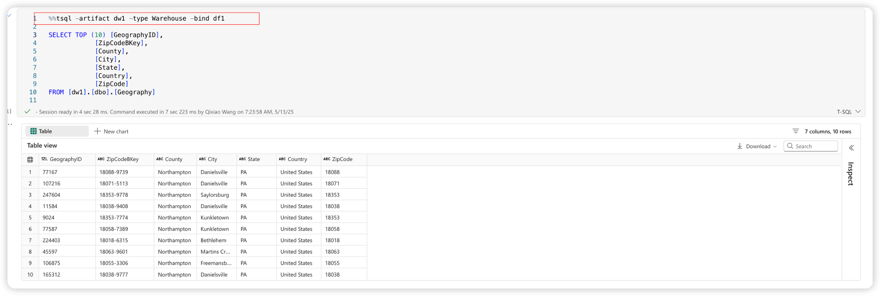 %%tsql -artifact dw1 -type Warehouse -bind df1
