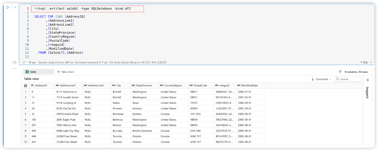 คุณยังสามารถใช้คําสั่งเวทมนตร์ T-SQL เพื่อสืบค้นฐานข้อมูล SQL ใน Fabric ได้อีกด้วย ไวยากรณ์จะคล้ายกับการสืบค้นคลังข้อมูล แต่ -type ต้องตั้งค่าพารามิเตอร์เป็น SQLDatabase. พารามิเตอร์ -bind ระบุชื่อของตัวแปรที่จะผูกผลลัพธ์ของคิวรี T-SQL