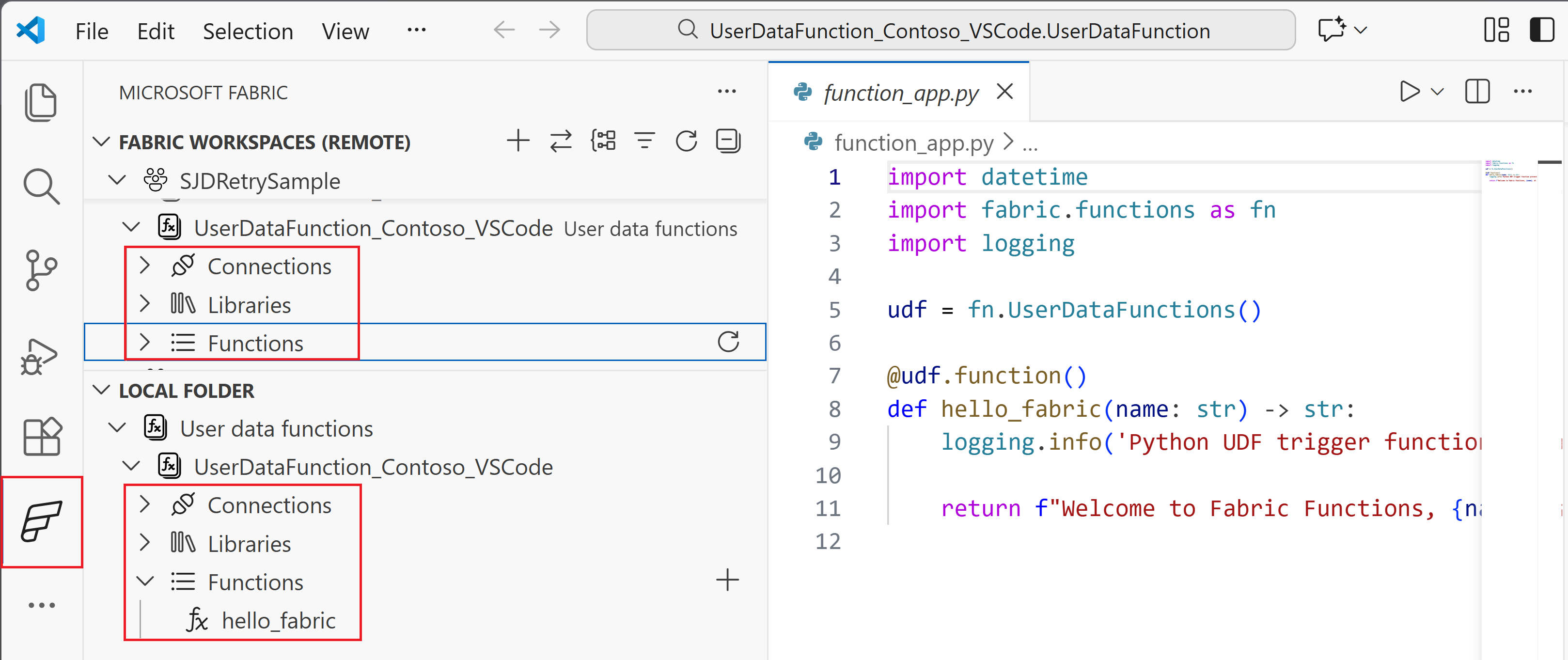 11. เปิดfunction_app.pyเพื่อดูฟังก์ชันเริ่มต้นhello_fabric คุณสามารถแก้ไขฟังก์ชันนี้หรือเพิ่มฟังก์ชันเพิ่มเติมได้