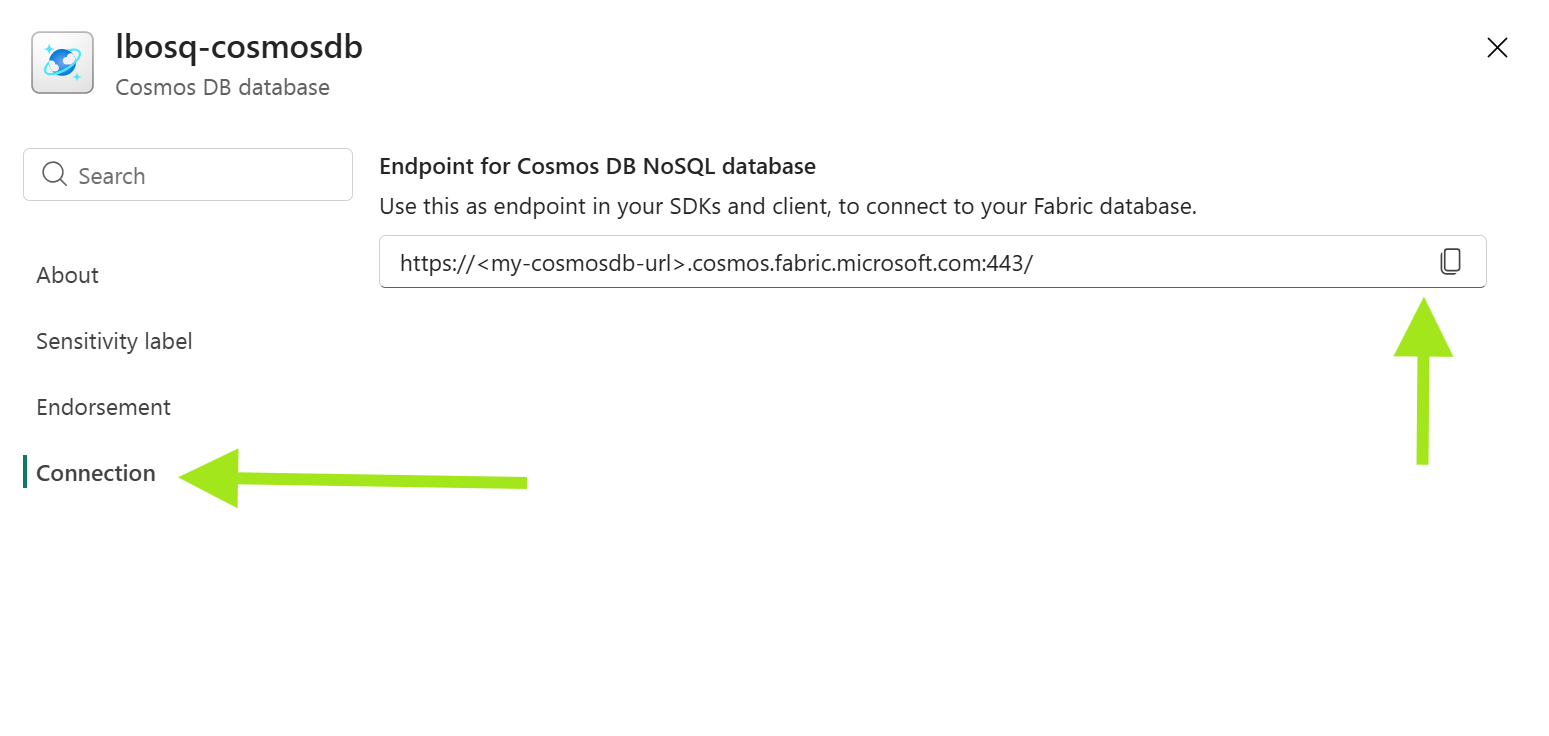 คุณยังสามารถใช้ขั้นตอนเหล่านี้เพื่อเชื่อมต่อกับฐานข้อมูล Azure Cosmos DB โดยใช้ URL บัญชีและชื่อฐานข้อมูล บัญชีเจ้าของฟังก์ชันข้อมูลผู้ใช้จะต้องมีสิทธิ์การเข้าถึงบัญชี Azure Cosmos DB นั้น