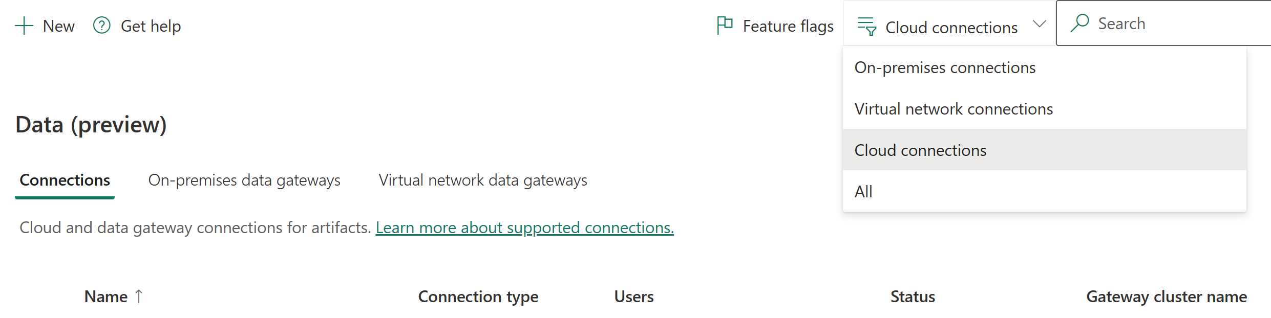 ตอนนี้การเชื่อมต่อระบบคลาวด์ทํางานร่วมกับไปป์ไลน์และ Kusto สําหรับชุดข้อมูล datamarts และกระแสข้อมูล คุณต้องใช้ประสบการณ์ "รับข้อมูล" ของ Power Query Online เพื่อสร้างการเชื่อมต่อระบบคลาวด์ส่วนบุคคล