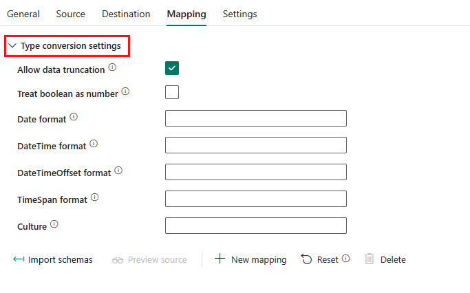 บนแท็บการแมป ให้ขยาย การตั้งค่าการแปลงประเภท เพื่อกําหนดค่าการแปลงประเภทหากจําเป็น