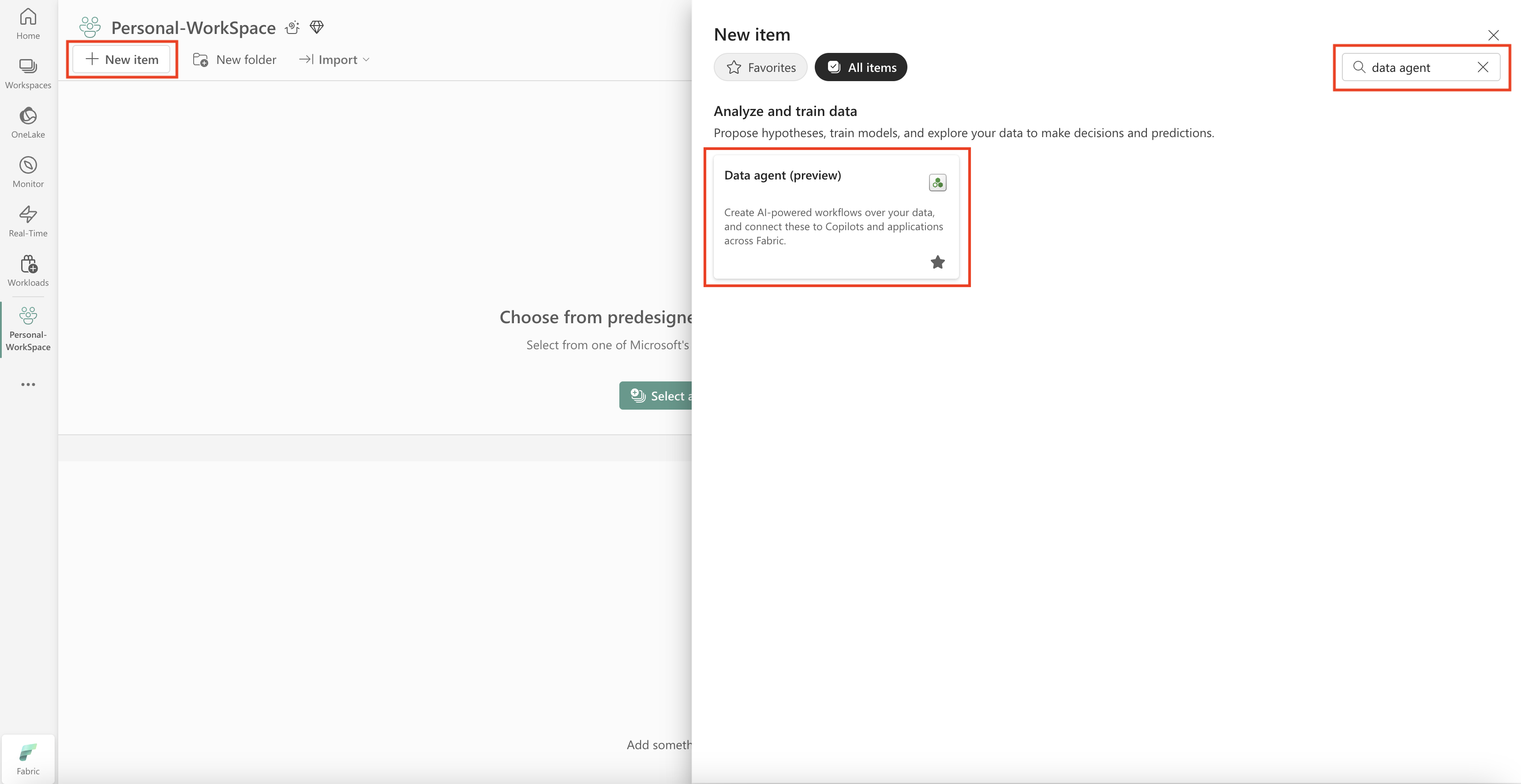 หากต้องการสร้างตัวแทนข้อมูล Fabric ใหม่ ก่อนอื่นให้นําทางไปยังพื้นที่ทํางานของคุณ จากนั้นเลือกปุ่ม + รายการใหม่ ในแท็บ รายการทั้งหมด ให้ค้นหา Fabric data agent เพื่อค้นหาตัวเลือกที่เหมาะสม ดังที่แสดงในภาพหน้าจอนี้: