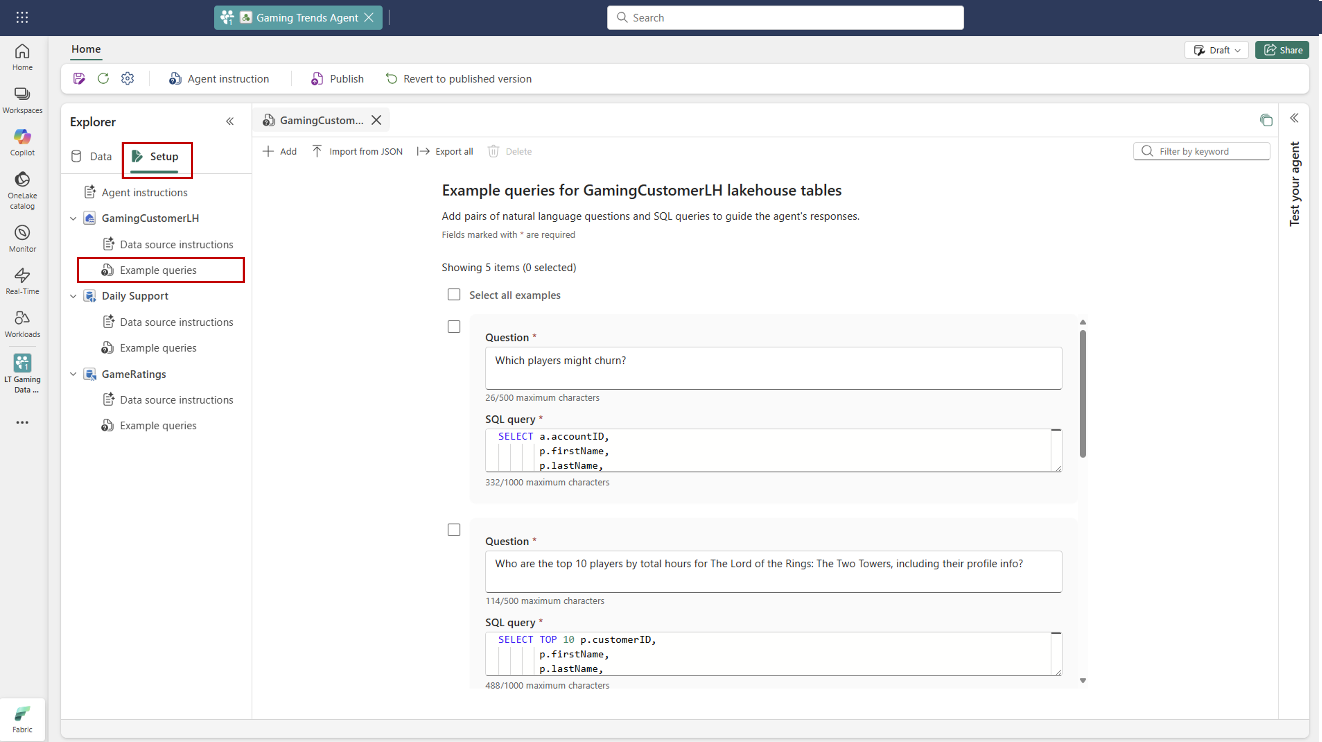 คุณสามารถเพิ่มความแม่นยําในการตอบสนองได้โดยการให้ตัวอย่างการสืบค้นที่ปรับให้เหมาะกับแหล่งข้อมูลที่รองรับแต่ละแหล่ง (เลคเฮาส์ คลังสินค้า ฐานข้อมูล KQL) แนวทางนี้เรียกว่า การเรียนรู้แบบ few shot ใน Generative AI ช่วยแนะนําตัวแทนข้อมูล Fabric ในการสร้างการตอบสนองที่สอดคล้องกับความคาดหวังของคุณได้ดียิ่งขึ้น