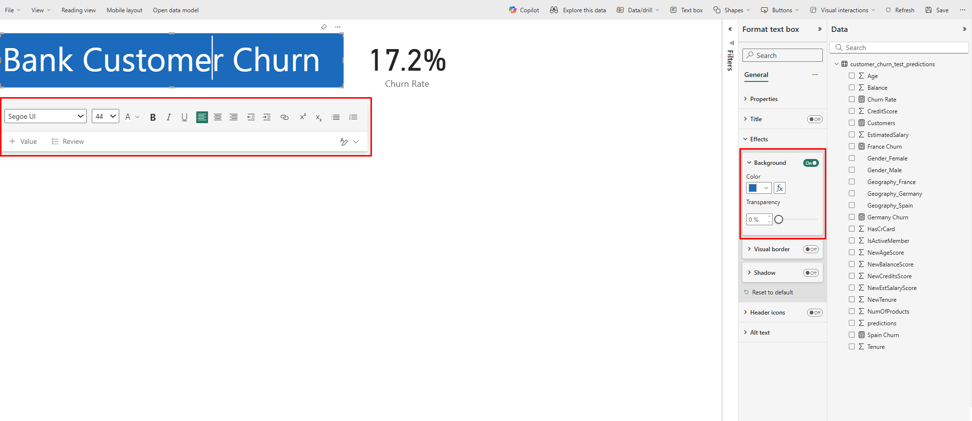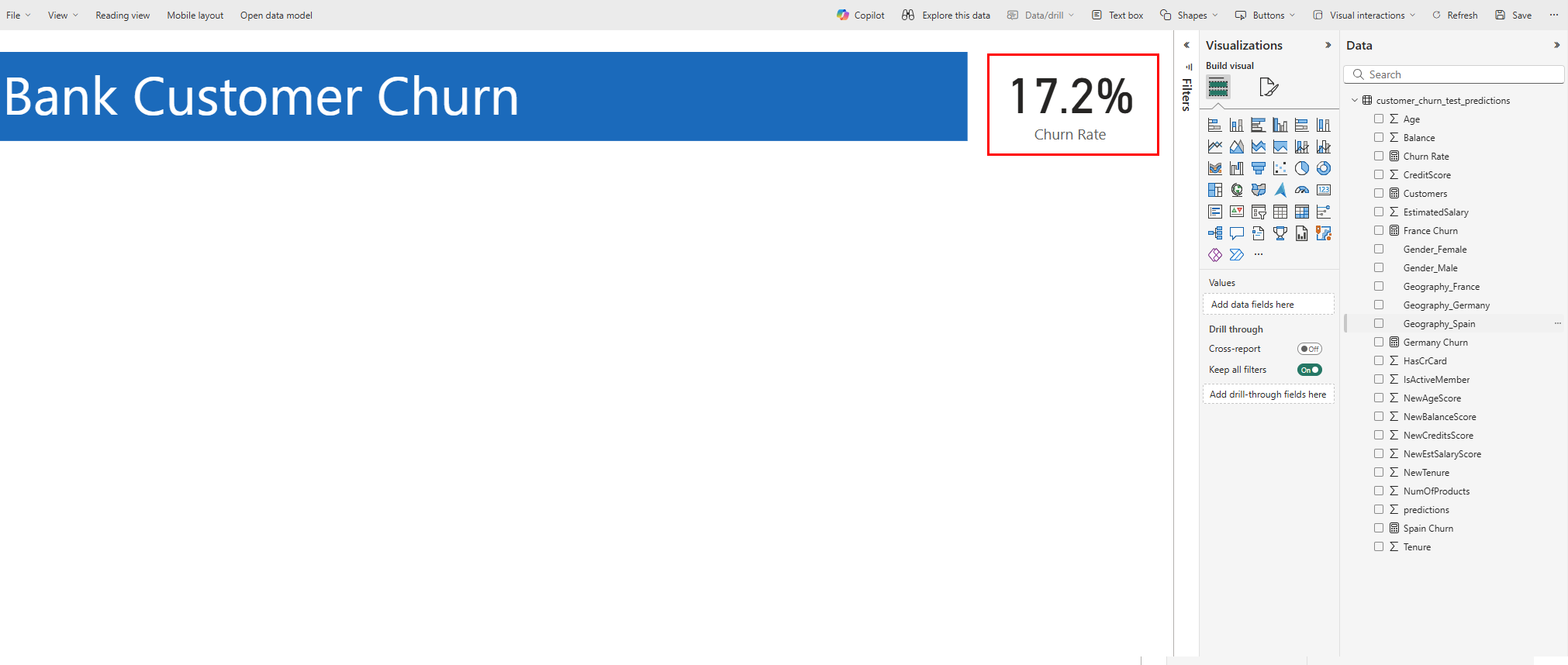 Spain Churn = CALCULATE(AVERAGE(customer_churn_test_predictions[predictions]),FILTER(customer_churn_test_predictions, customer_churn_test_predictions[Geography_Spain] = TRUE()))อัตราการเลิกใช้บริการของฝรั่งเศส: