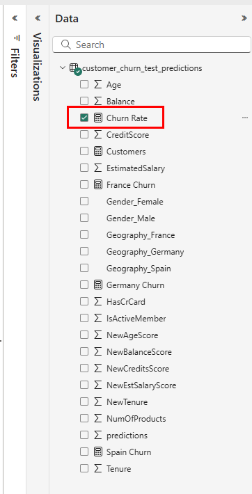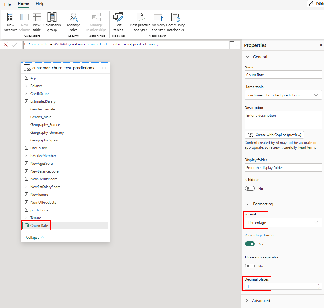 Measure =ในแถบสูตรด้วย:Germany Churn = CALCULATE(AVERAGE(customer_churn_test_predictions[predictions]),FILTER(customer_churn_test_predictions, customer_churn_test_predictions[Geography_Germany] = TRUE()))คําสั่งนี้จะแยกแถวเหล่านั้นที่มีเยอรมนีเป็นภูมิศาสตร์ของพวกเขา (Geography_Germany เท่ากับหนึ่ง)