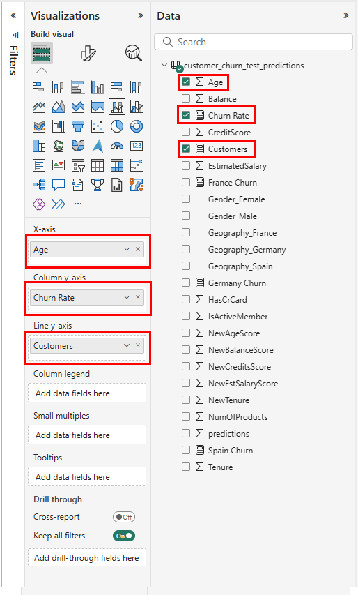 ในแผงการแสดงภาพ เลือก การ์ดแผนภูมิ คอลัมน์แบบกลุ่ม เลือก Germany Churn, Spain Churn, France Churn ตามลําดับสําหรับแกน y ดังที่แสดงในภาพหน้าจอต่อไปนี้ ปรับขนาดแต่ละแผนภูมิรายงานตามความจําเป็น