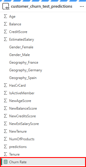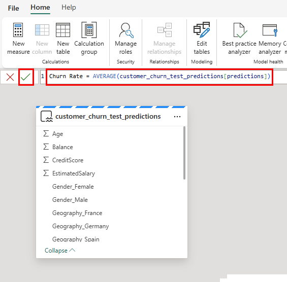 Measure =ในแถบสูตรด้วยส่วนย่อยของโค้ดต่อไปนี้:Churn Rate = AVERAGE(customer_churn_test_predictions[predictions])เมื่อต้องการใช้สูตร ให้เลือกเครื่องหมายถูกในแถบสูตร ดังที่แสดงในภาพหน้าจอต่อไปนี้: