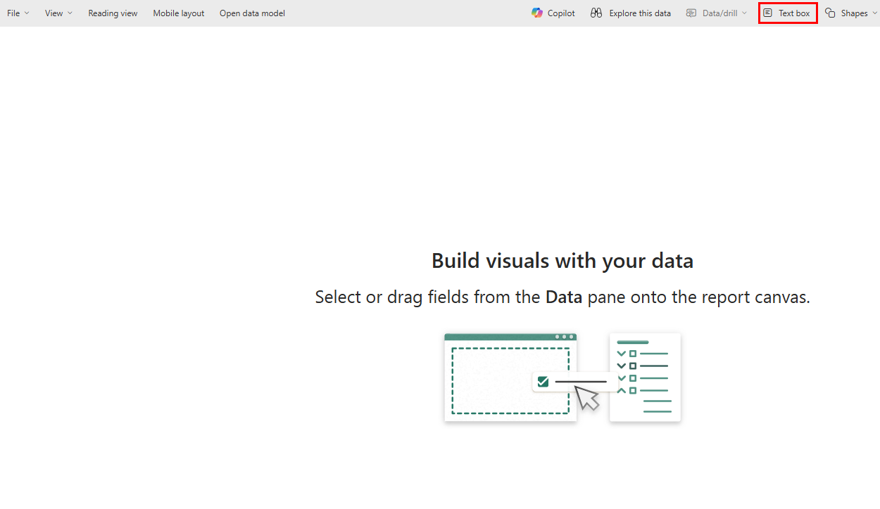 เมื่อคุณเสร็จสิ้นการดําเนินการทั้งหมดที่อธิบายไว้ก่อนหน้านี้แล้ว ให้เลือก สร้างรายงานใหม่ ในรายการตัวเลือกไฟล์ริบบิ้นด้านบนเพื่อเปิดหน้าการเขียนรายงาน Power BI ดังที่แสดงในสกรีนช็อตต่อไปนี้: