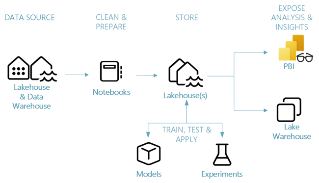 ขั้นตอนมักจะดําเนินการซ้ํา ๆ เป้าหมายและเกณฑ์ความสําเร็จของแต่ละขั้นตอนขึ้นอยู่กับการทํางานร่วมกัน การแชร์ข้อมูล และเอกสารประกอบ ประสบการณ์ด้านวิทยาศาสตร์ข้อมูล Fabric เกี่ยวข้องกับคุณสมบัติที่สร้างขึ้นในแบบดั้งเดิมหลายรายการซึ่งช่วยให้การทํางานร่วมกันที่ราบรื่นการรวบรวมข้อมูลการแชร์และการบริโภค
