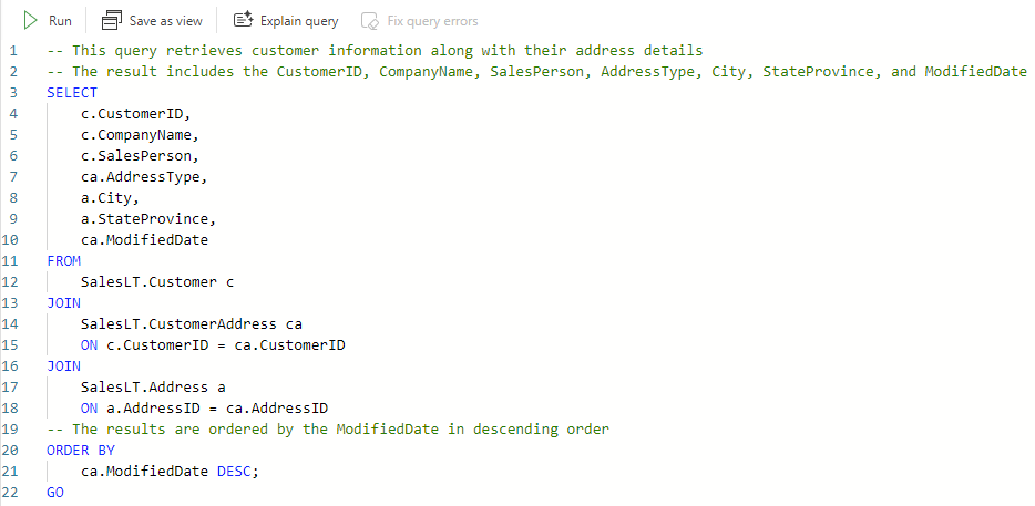 Copilot วิเคราะห์คิวรีของคุณ และพยายามค้นหาวิธีที่ดีที่สุดในการแก้ไข นอกจากนี้ยังเพิ่มข้อคิดเห็นเพื่ออธิบายสิ่งที่แก้ไขและสาเหตุ
