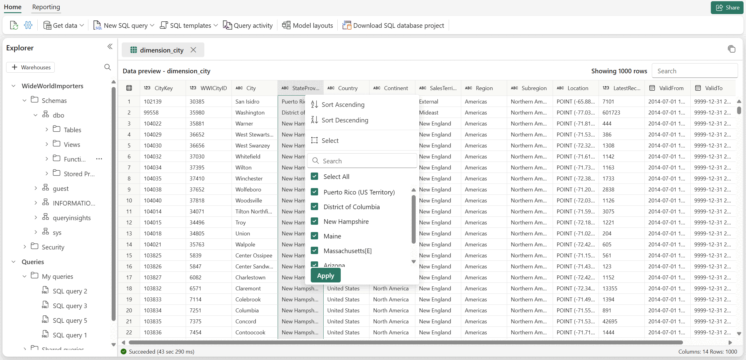 หลังจากสร้างคลังสินค้าและรวบรวมข้อมูลแล้ว ให้เลือกตารางหรือมุมมองเฉพาะจาก Object explorer ที่คุณต้องการแสดงในตารางข้อมูลของหน้าแสดงตัวอย่างข้อมูล
