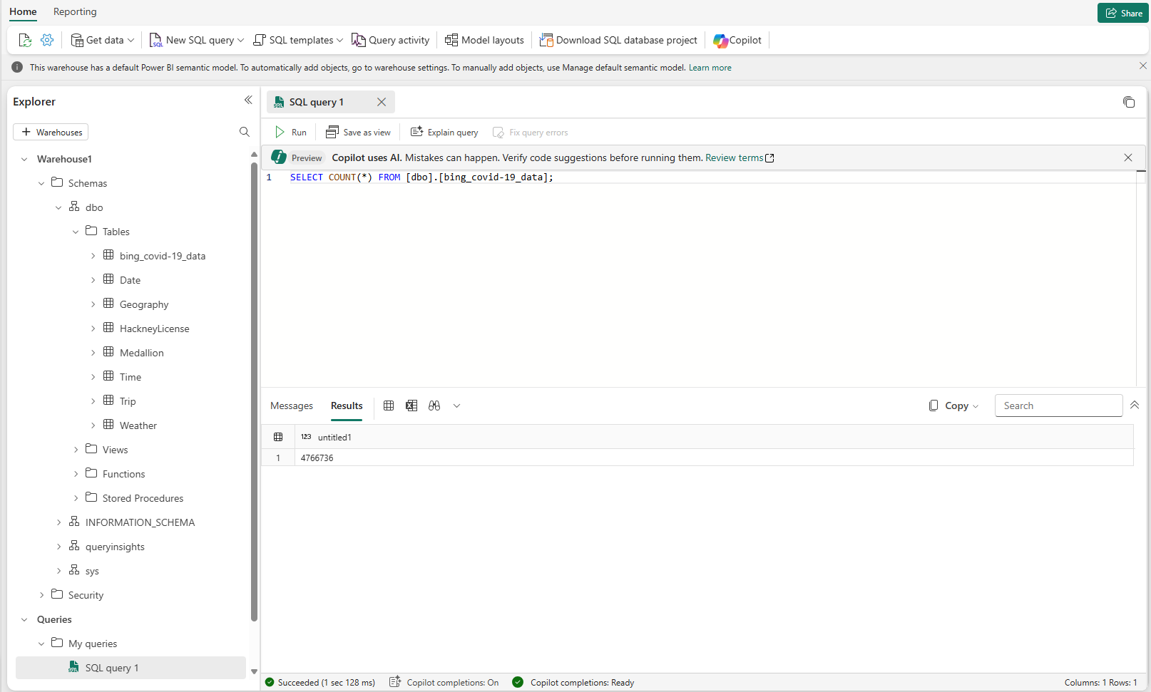 ในบทความนี้ เรียนรู้วิธีคิวรีคลังสินค้าหรือจุดสิ้นสุดการวิเคราะห์ SQL ใน Microsoft Fabric