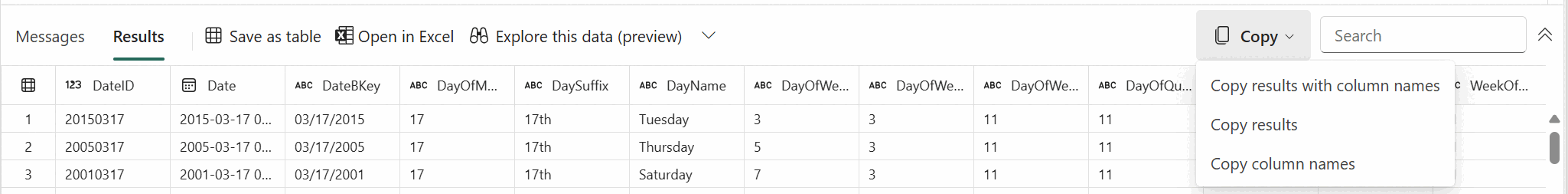 รายการดรอปดาวน์ คัดลอก ช่วยให้คุณสามารถคัดลอกผลลัพธ์และ/หรือชื่อคอลัมน์ในตารางข้อมูลได้ คุณสามารถเลือกที่จะคัดลอกผลลัพธ์ด้วยชื่อคอลัมน์ เพียงแค่คัดลอกเฉพาะผลลัพธ์เท่านั้น หรือคัดลอกเฉพาะชื่อคอลัมน์เท่านั้น
