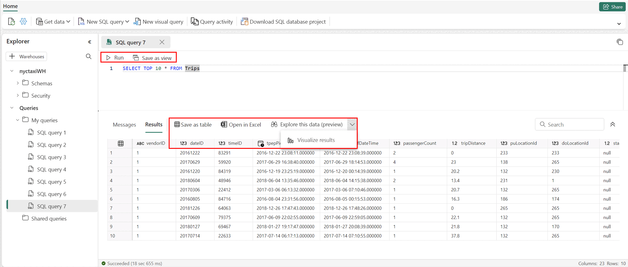 เมื่อต้องการเปิดใช้งานบันทึกเป็นมุมมอง บันทึกเป็นตาราง เปิดใน Excel สํารวจข้อมูลนี้ (ตัวอย่าง) และเมนูผลลัพธ์แบบแสดงภาพ เน้นคําสั่ง SQL ที่มีSELECTคําสั่งในตัวแก้ไขคิวรี SQL