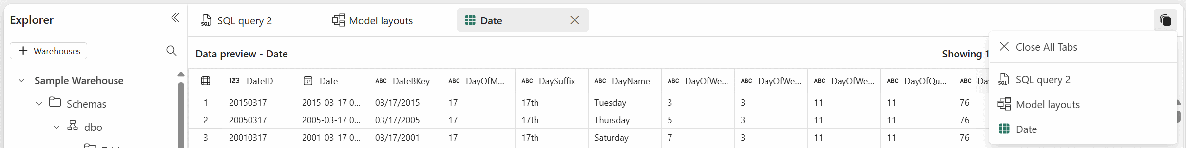 ประสบการณ์การแสดงตัวอย่างข้อมูล การคิวรี และการสร้างแบบจําลองจะเปิดขึ้นเป็นแต่ละแท็บที่คุณสามารถทํางานหลายงานร่วมกันในตัวแก้ไข ถ้าคุณกําลังเขียนแบบสอบถาม คุณสามารถสลับระหว่างการดูตัวอย่างข้อมูลและการดูความสัมพันธ์ระหว่างตารางที่คุณกําลังเขียนแบบสอบถามได้ หากต้องการดูหรือปิดแท็บทั้งหมด ให้เลือกไอคอนทางด้านขวาของแท็บทั้งหมด