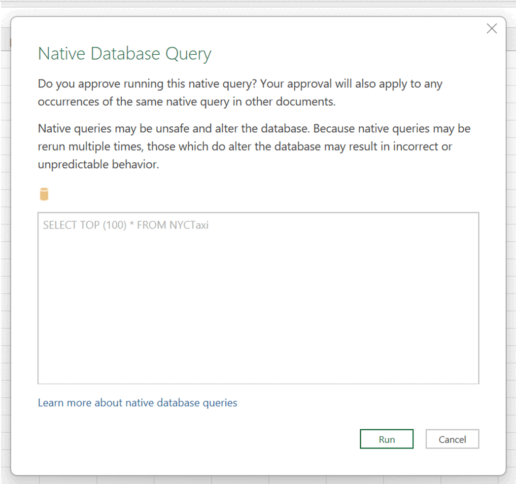 2. เมื่อต้องการดูข้อมูล เลือกปุ่ม เปิดใช้งานการแก้ไข ในมุมมอง ที่ได้รับการป้องกัน ribbon ตามด้วยปุ่ม เปิดใช้งานเนื้อหา ใน ribbon คําเตือน ด้านความปลอดภัย เมื่อเปิดใช้งานทั้งสองอย่างแล้ว คุณจะเห็นกล่องโต้ตอบต่อไปนี้เพื่ออนุมัติการเรียกใช้คิวรีที่แสดงรายการ ภาพหน้าจอจาก Microsoft Excel ที่แสดงกล่องโต้ตอบคิวรีในระบบของฐานข้อมูล