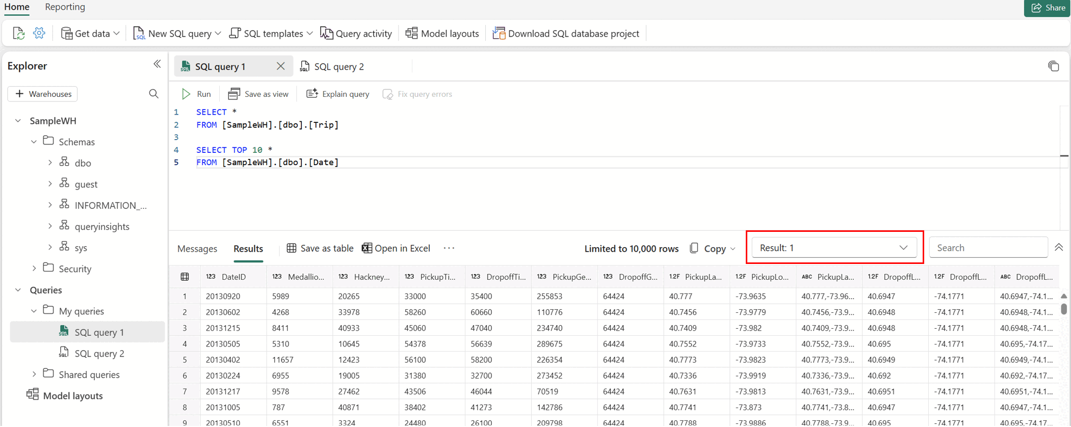 เมื่อคุณเรียกใช้หลายคิวรีและคิวรีที่ส่งกลับหลายผลลัพธ์ คุณสามารถเลือกรายการดรอปดาวน์ผลลัพธ์เพื่อดูผลลัพธ์แต่ละรายการได้