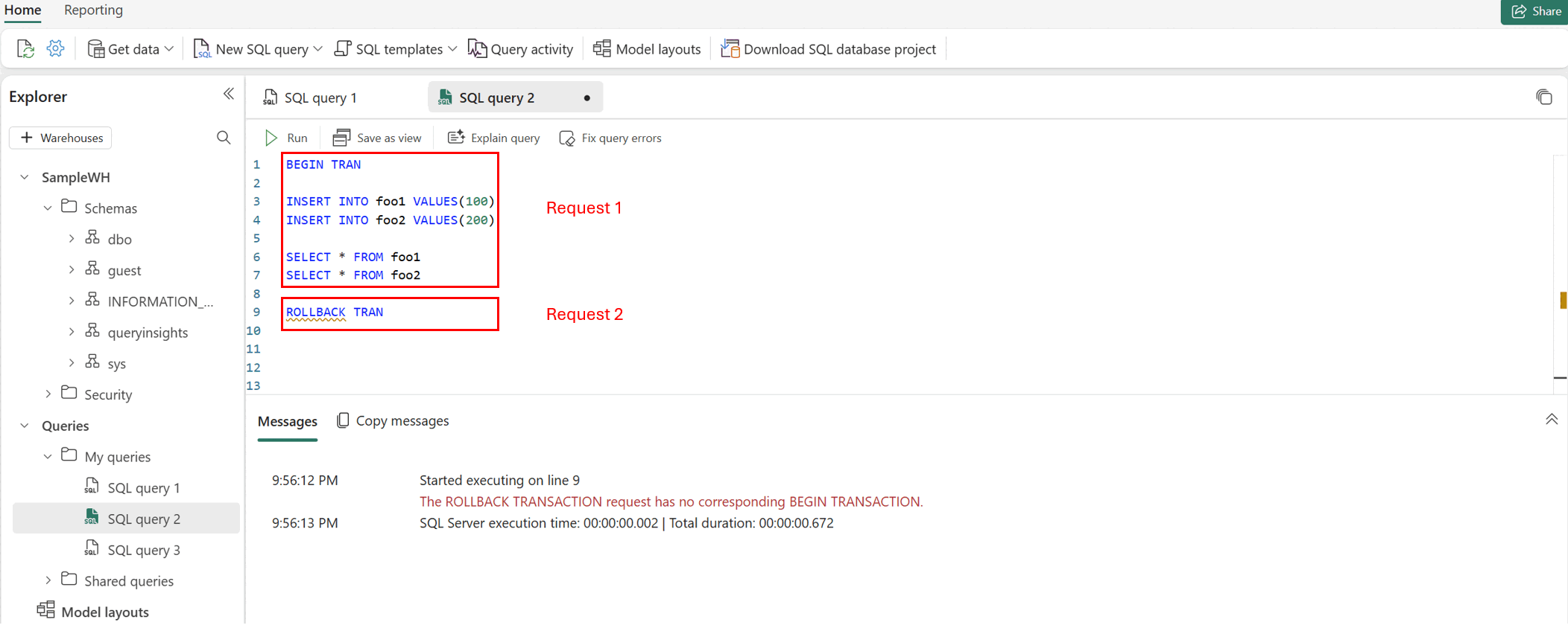 สกรีนช็อตที่แสดงการเรียกใช้ธุรกรรมแบบอิสระที่ล้มเหลวในตัวแก้ไขคิวรี SQL