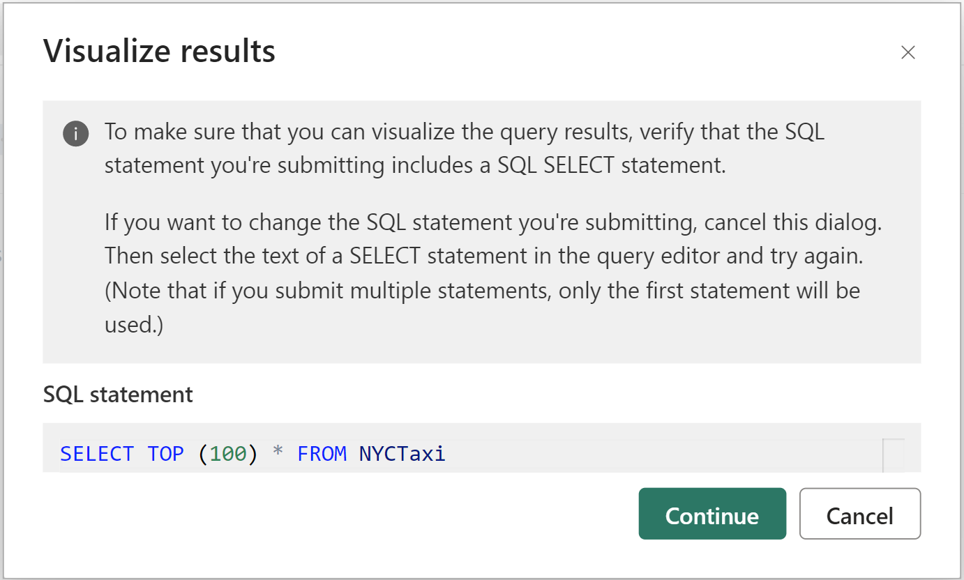 • คําสั่ง T-SQL ที่ใช้ไวยากรณ์ T-SQL OPTION ในขณะนี้ยังไม่รองรับในการ สํารวจข้อมูล นี้หรือ แสดงตัวเลือกผลลัพธ์ ด้วยโหมด DirectQuery การแก้ไขปัญหาชั่วคราวคือการสร้างการแสดงภาพใน Power BI Desktop โดยใช้โหมดการนําเข้า
