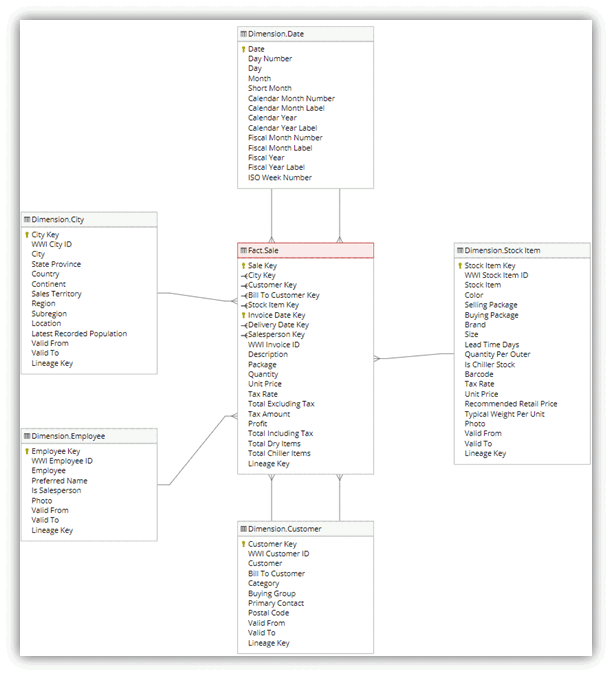 แบบจําลองมิติสงครามโลกครั้งที่ 1 มีตารางข้อเท็จจริงหลายตารางในสคีมาดาว ในบทช่วยสอนนี้ คุณมุ่งเน้นไปที่ตาราง fact_sale และ มิติที่เกี่ยวข้อง เพื่อสาธิตสถานการณ์คลังข้อมูลแบบ end-to-end: