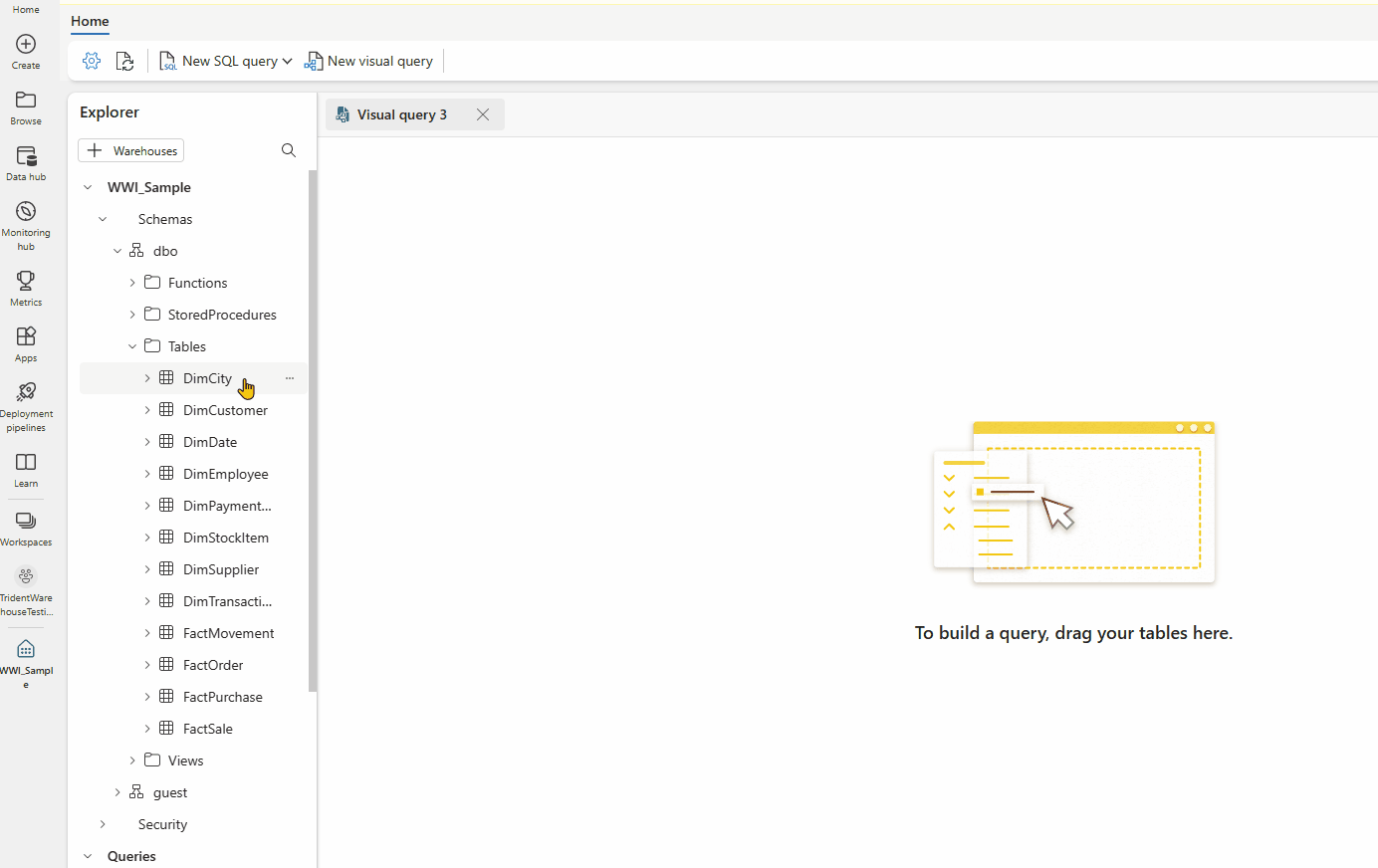 หากต้องการสร้างคิวรี ให้ลากและวางตารางจาก Object explorer ลงบนพื้นที่ทํางาน เมื่อต้องการลากตาราง เลือกและกดตารางค้างไว้จนกว่าคุณจะเห็นตารางถูกเลือกจาก Object explorer ก่อนทําการลาก เมื่อคุณลากตารางหนึ่งตารางขึ้นไปลงบนพื้นที่ทํางาน คุณสามารถใช้ประสบการณ์การใช้งานวิชวลเพื่อออกแบบคิวรีของคุณได้ ตัวแก้ไขคลังสินค้าใช้ประสบการณ์มุมมองแผนภาพ Power Query เพื่อให้คุณสามารถคิวรีและวิเคราะห์ข้อมูลของคุณได้อย่างง่ายดาย เรียนรู้เพิ่มเติมเกี่ยวกับ มุมมองไดอะแกรม Power Query