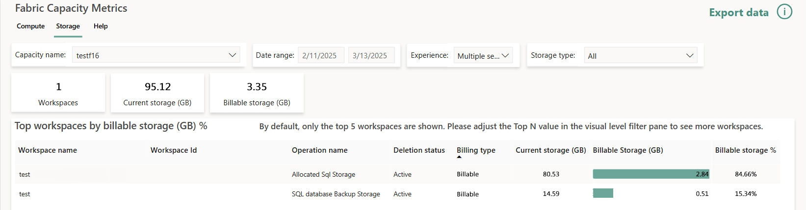 การรายงานการใช้งานที่เก็บข้อมูลเกิดขึ้นในระดับพื้นที่ทํางาน ถ้าคุณต้องการข้อมูลเพิ่มเติมเกี่ยวกับการใช้ที่เก็บข้อมูลภายในฐานข้อมูล ให้ดู แดชบอร์ดประสิทธิภาพการทํางานสําหรับฐานข้อมูล SQL ใน Microsoft Fabric