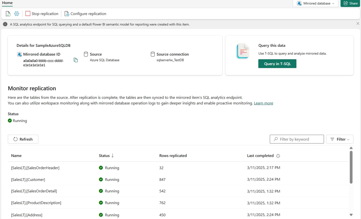 คุณสามารถตรวจสอบฐานข้อมูลที่มิเรอร์โดยทางโปรแกรมโดยใช้ REST API หรือ SDK เรียนรู้เพิ่มเติมจาก Microsoft Fabric มิเรอร์ REST API สาธารณะ เกี่ยวกับวิธีการรับสถานะการมิเรอร์สําหรับฐานข้อมูลมิเรอร์หรือตารางเฉพาะ