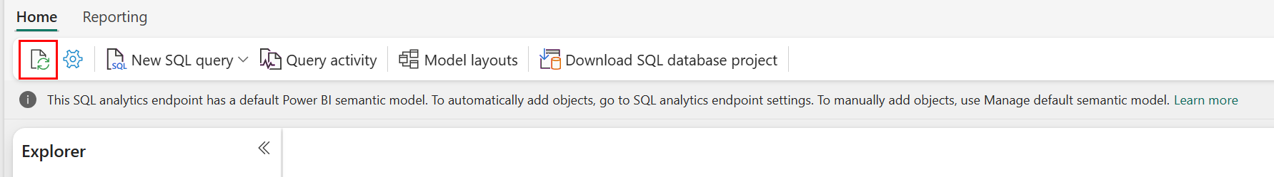 คุณสามารถบังคับให้รีเฟรชการสแกนข้อมูลเมตาอัตโนมัติได้ด้วยตนเอง บนหน้าสําหรับจุดสิ้นสุดการวิเคราะห์ SQL ให้เลือกปุ่มรีเฟรช ตามที่แสดงในภาพต่อไปนี้ รอสักครู่แล้วสืบค้นข้อมูลอีกครั้งเพื่อตรวจสอบ