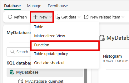 1. เรียกดูฐานข้อมูล KQL ของคุณ และเลือก ฟังก์ชันใหม่> คําสั่ง .create-or-alter จะถูกเติม ลงในหน้าต่าง สํารวจข้อมูลของคุณ โดยอัตโนมัติ