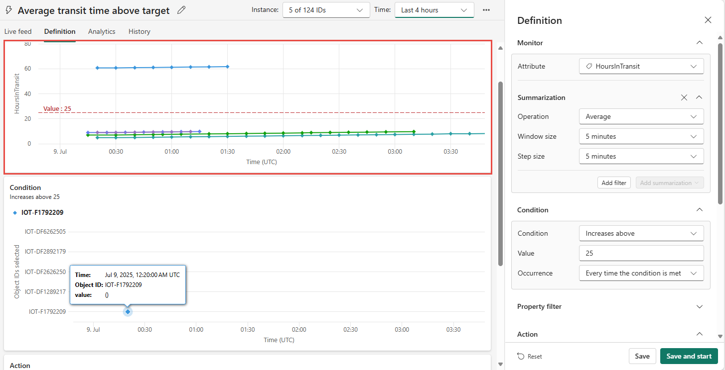 คุณควรเห็นกฎภายใต้ HoursInTransit ในบานหน้าต่าง Explorer เลือกกฎ ในบานหน้าต่างตรงกลาง เลือกไอคอนรูปดินสอที่ด้านบน และอัปเดตชื่อเป็นเวลาขนส่งโดยเฉลี่ยเหนือเป้าหมาย