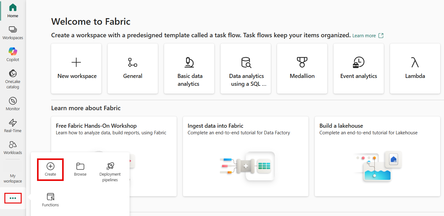 ก่อนที่คุณจะเริ่มต้น คุณต้องมีพื้นที่ทํางานที่มีความจุ Fabric คุณสามารถเรียนรู้เกี่ยวกับพื้นที่ทํางาน Fabric ได้ในบทความพื้นที่ทํางาน ถ้าคุณไม่มี Fabric คุณจะได้รับแจ้งให้เริ่มทดลองใช้