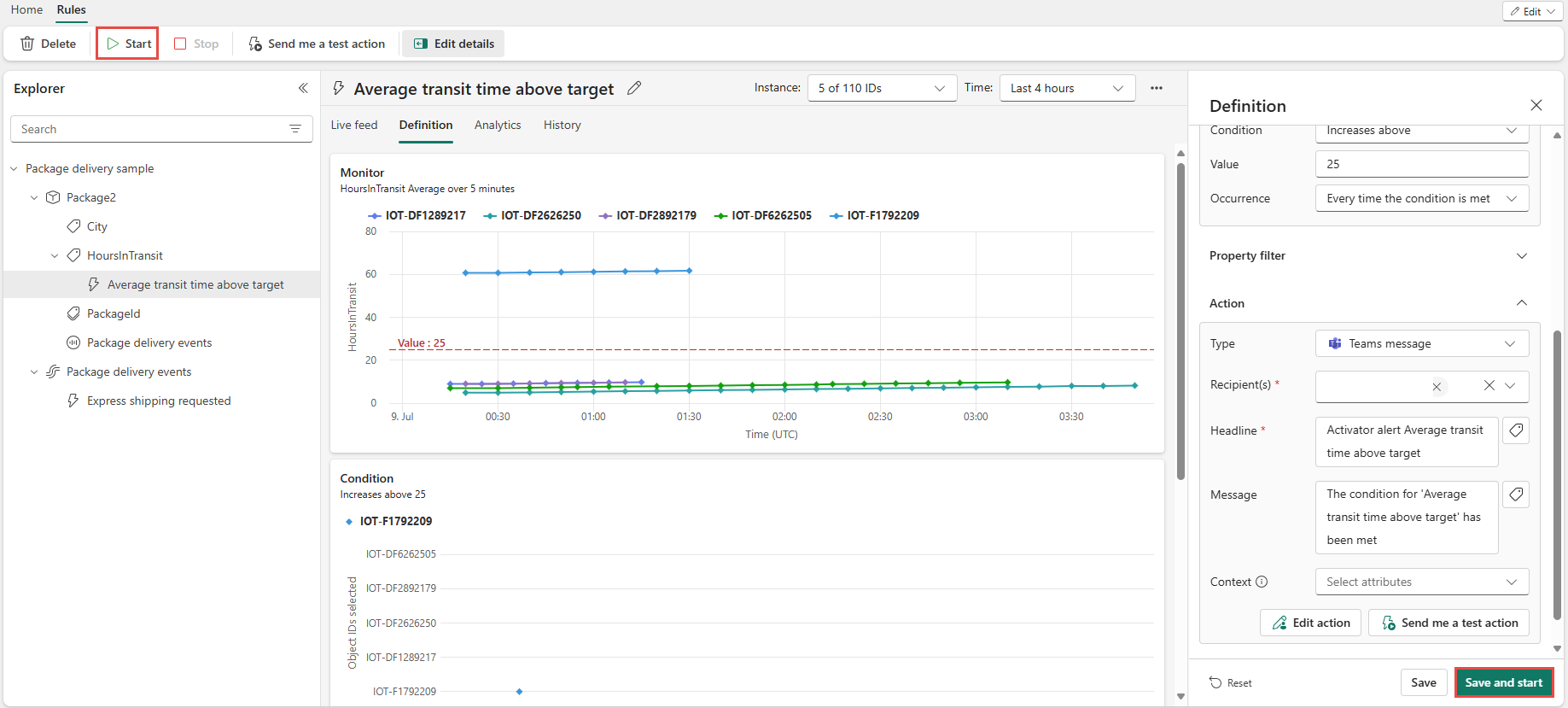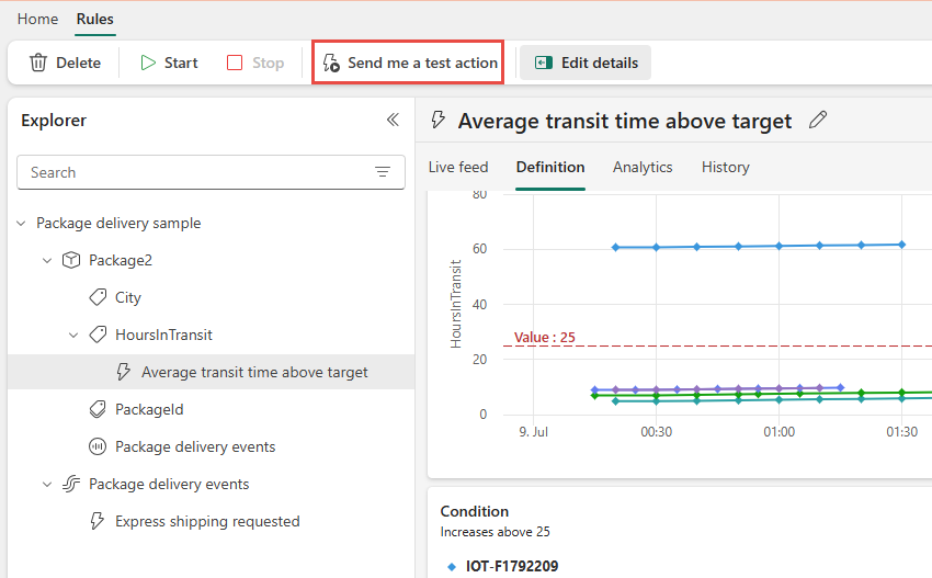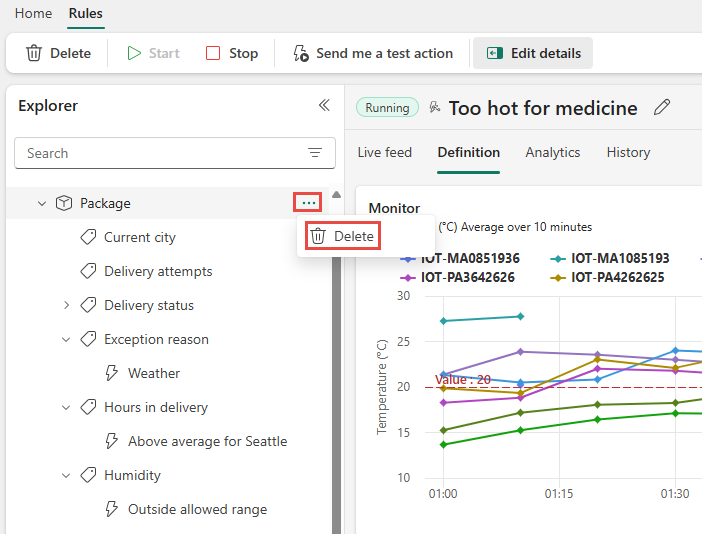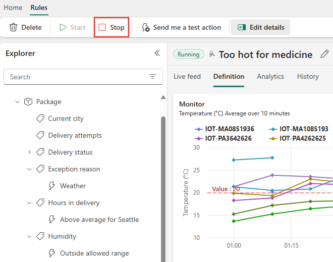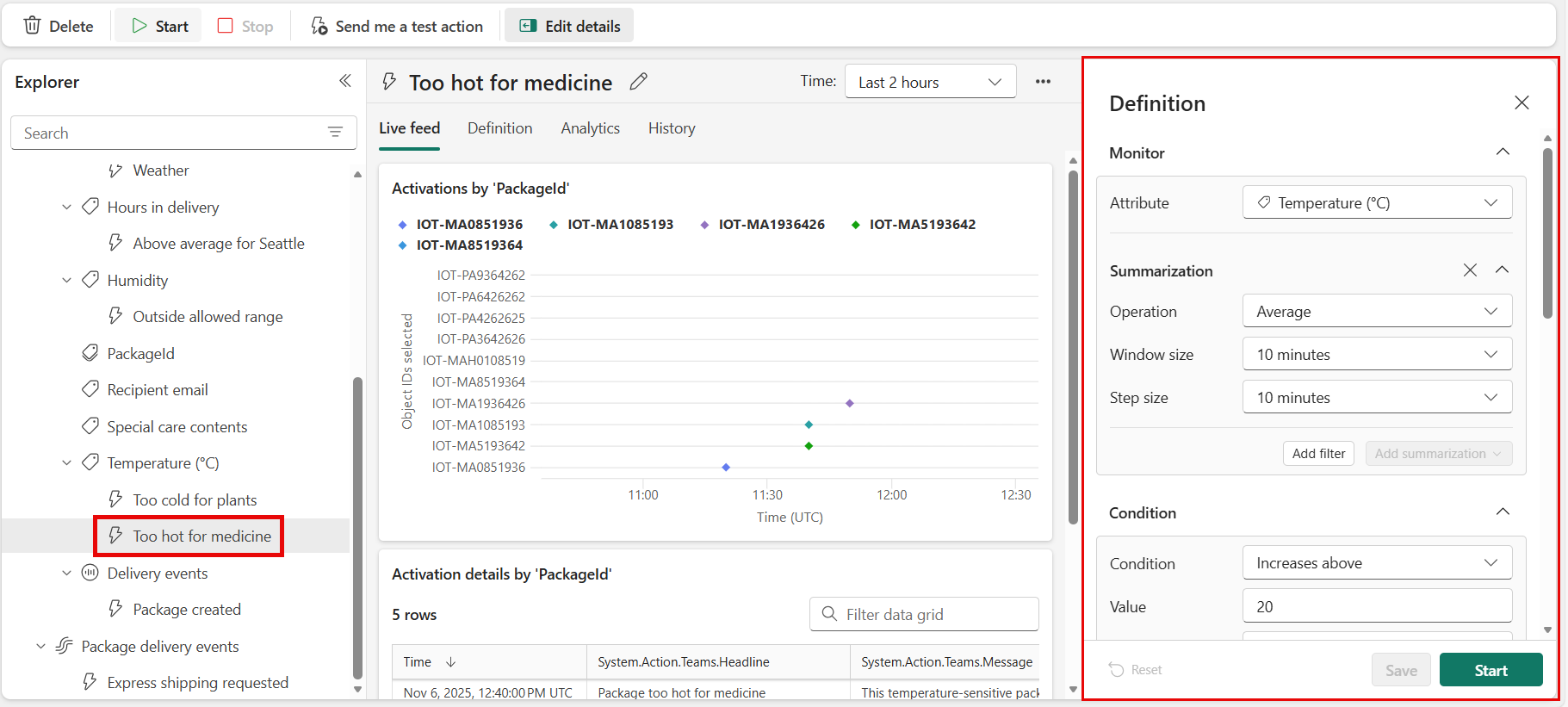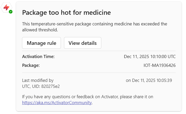 เราได้สร้างกฎ Fabric Activator กฎกําลังทํางานเทียบกับ เหตุการณ์ การส่งแพคเกจ กฎจะค้นหาแพคเกจที่มียาและตรวจสอบเพื่อดูว่าอุณหภูมิสูงกว่า 20 องศาเซลเซียสหรือไม่ เมื่ออุณหภูมิมากกว่า 20 องศาเซลเซียส จะมีการส่งข้อความถึง Teams