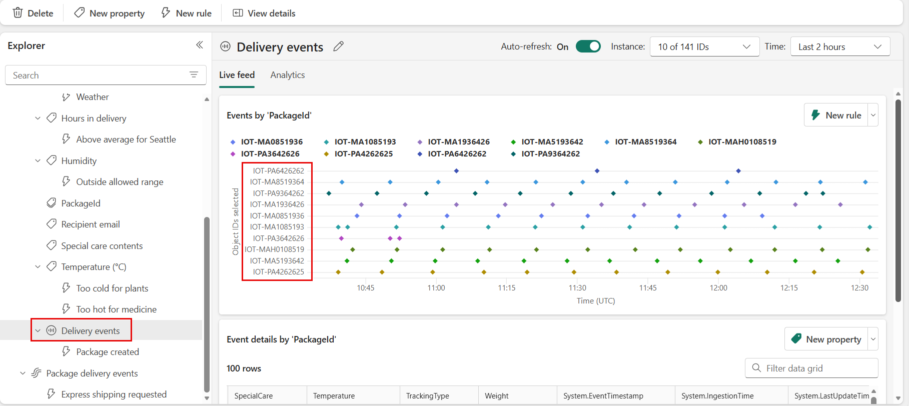 ดูเหตุการณ์ที่เข้ามา และโฮเวอร์เหนือข้อมูลเหตุการณ์ในตารางสด แต่ละจุดข้อมูลประกอบด้วยข้อมูลเกี่ยวกับเหตุการณ์ คุณอาจต้องเลื่อนเพื่อดูทั้งหมด