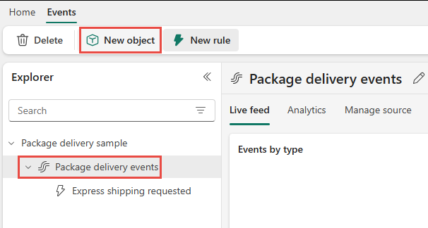 เลือกสตรีม เหตุการณ์การส่งแพคเกจ จากนั้นเลือก วัตถุใหม่ บนริบบอน