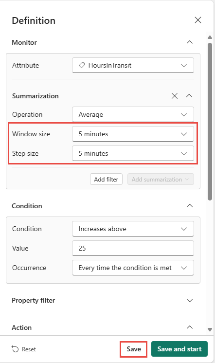 ตั้งค่าขนาดหน้าต่างการรวมห้านาทีและขนาดขั้นตอนห้านาทีจากนั้นเลือกบันทึก