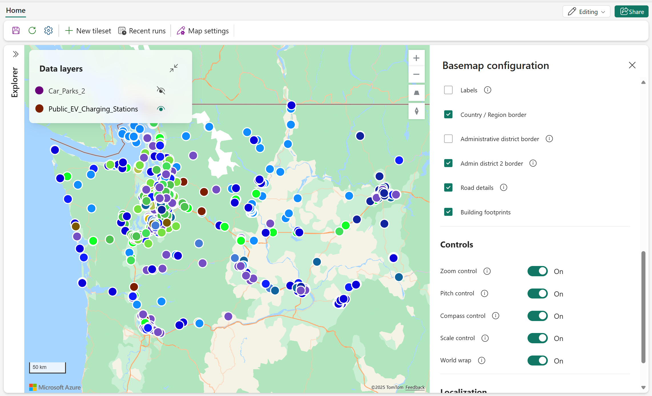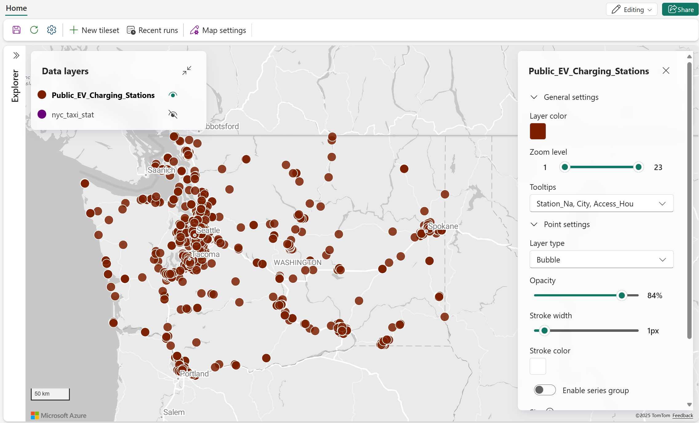 ภาพหน้าจอต่อไปนี้แสดงตําแหน่งสถานีชาร์จ EV ทั่วรัฐวอชิงตัน เลเยอร์ฟองใช้เพื่อแสดงข้อมูล ซึ่งประกอบด้วยคุณสมบัติจุด แต่ละสถานีจะแสดงเป็นฟองอากาศ โดยมีขนาดและความทึบที่ปรับแต่งเพื่อสะท้อนถึงคุณลักษณะเฉพาะของสถานี