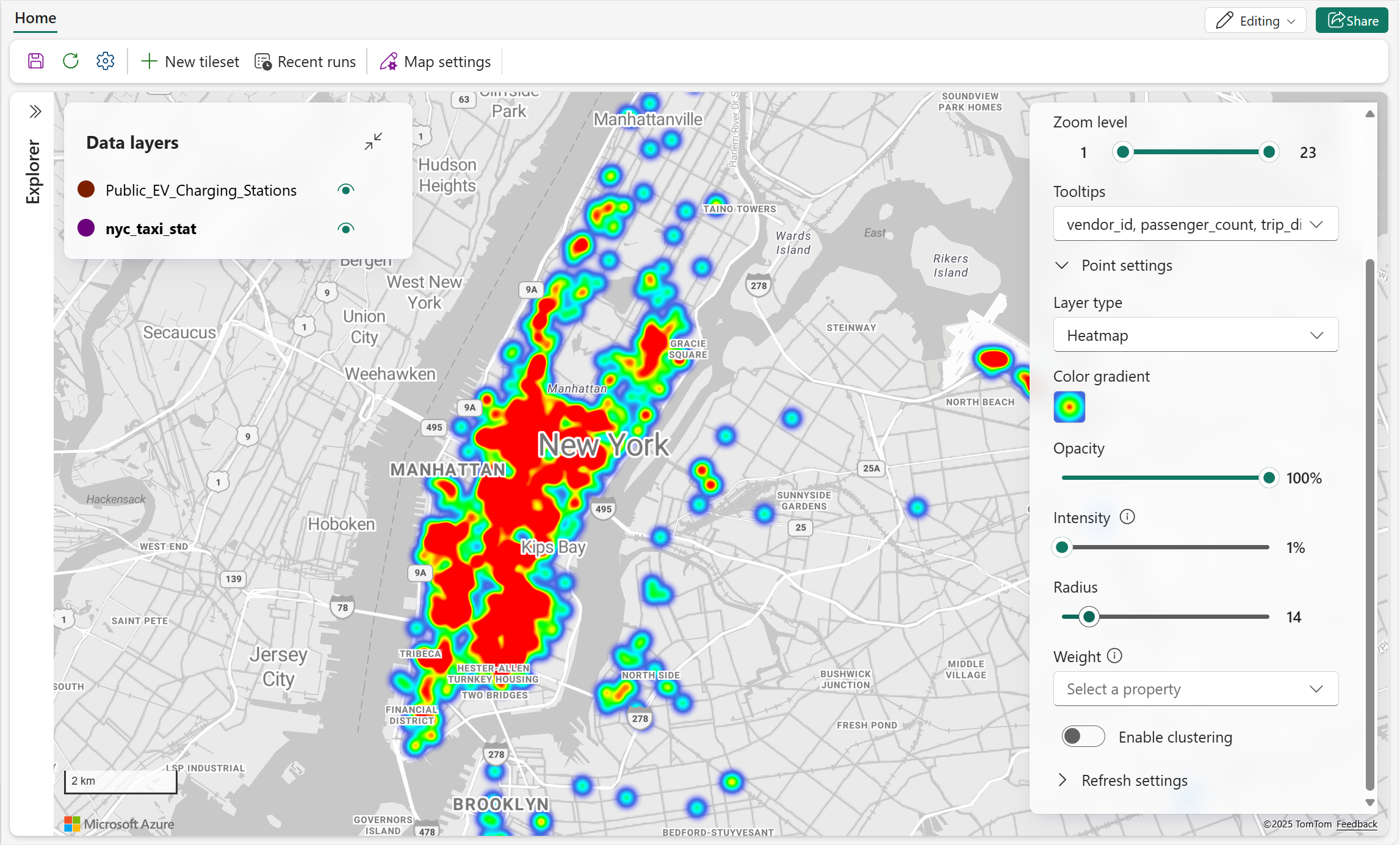 ภาพหน้าจอต่อไปนี้แสดงแผนที่ความร้อนของการเดินทางด้วยแท็กซี่ของนิวยอร์กซิตี้ การเดินทางแต่ละครั้งจะแสดงเป็นจุดข้อมูล โดย fare_amount จะใช้เป็นน้ําหนัก ซึ่งหมายความว่าพื้นที่ที่มีค่าโดยสารสูงกว่าจะเพิ่มความเข้มข้นให้กับแผนที่ความร้อน เพื่อเพิ่มความสามารถในการอ่าน จึงใช้ความทึบที่ต่ําลง ทําให้แผนที่และข้อมูลที่ทับซ้อนกันยังคงมองเห็นได้