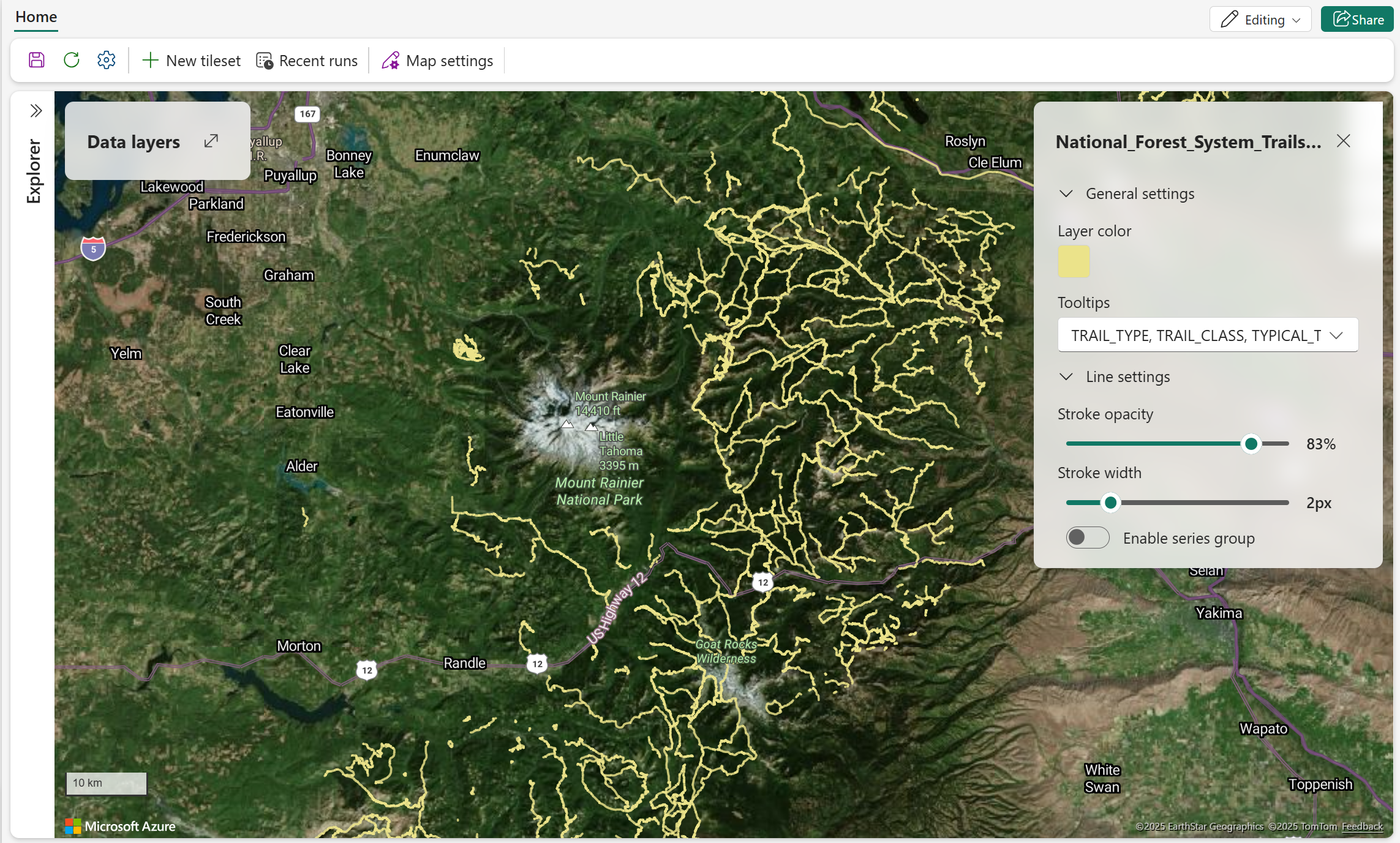 ภาพหน้าจอต่อไปนี้แสดงข้อมูลเส้นทางป่าสงวนแห่งชาติใกล้กับภูเขา Rainier เปิดใช้งานกลุ่มชุดและใช้คุณสมบัติ ATV_RESTRICTED ข้อมูลเพื่อระบุเส้นทางที่จํากัดรถเอทีวี (All-Terrain ยานพาหนะ)