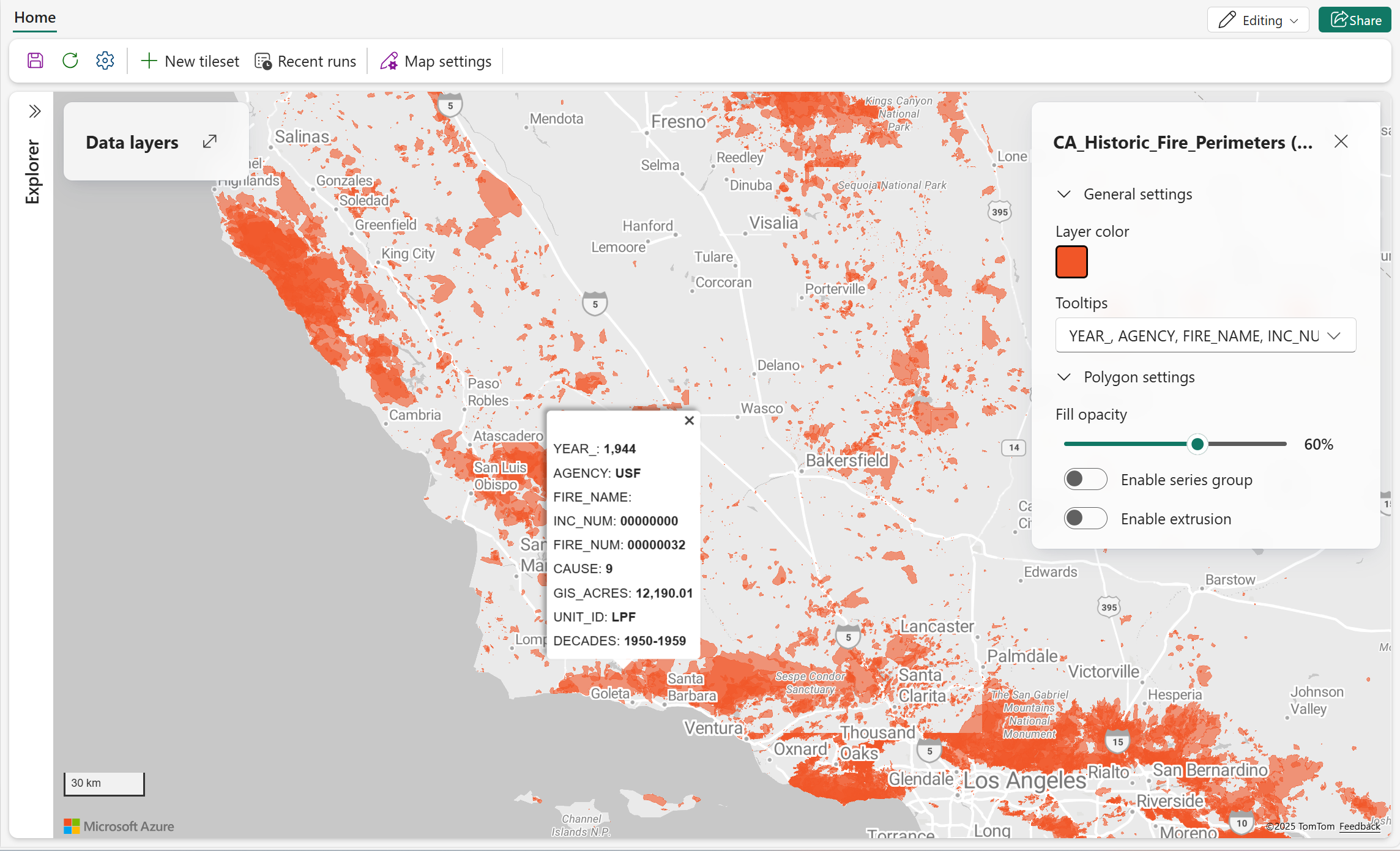 ภาพหน้าจอต่อไปนี้แสดงแผนที่ปริมณฑลไฟในอดีตของแคลิฟอร์เนีย ซึ่งแสดงขอบเขตทางภูมิศาสตร์ของไฟป่าในอดีตโดยใช้รูปหลายเหลี่ยมสีแดง รูปหลายเหลี่ยมแต่ละรูปแสดงถึงเหตุการณ์ไฟไหม้ที่แตกต่างกัน และมีข้อมูลเมตา เช่น ปี สาเหตุ และพื้นที่ที่คํานวณโดย GIS การแสดงภาพนี้ช่วยให้ผู้ใช้สามารถระบุพื้นที่ที่เสี่ยงต่อการเกิดไฟไหม้วิเคราะห์รูปแบบไฟในอดีตและสนับสนุนการบรรเทาไฟป่าและการวางแผนการจัดการที่ดินได้อย่างรวดเร็ว