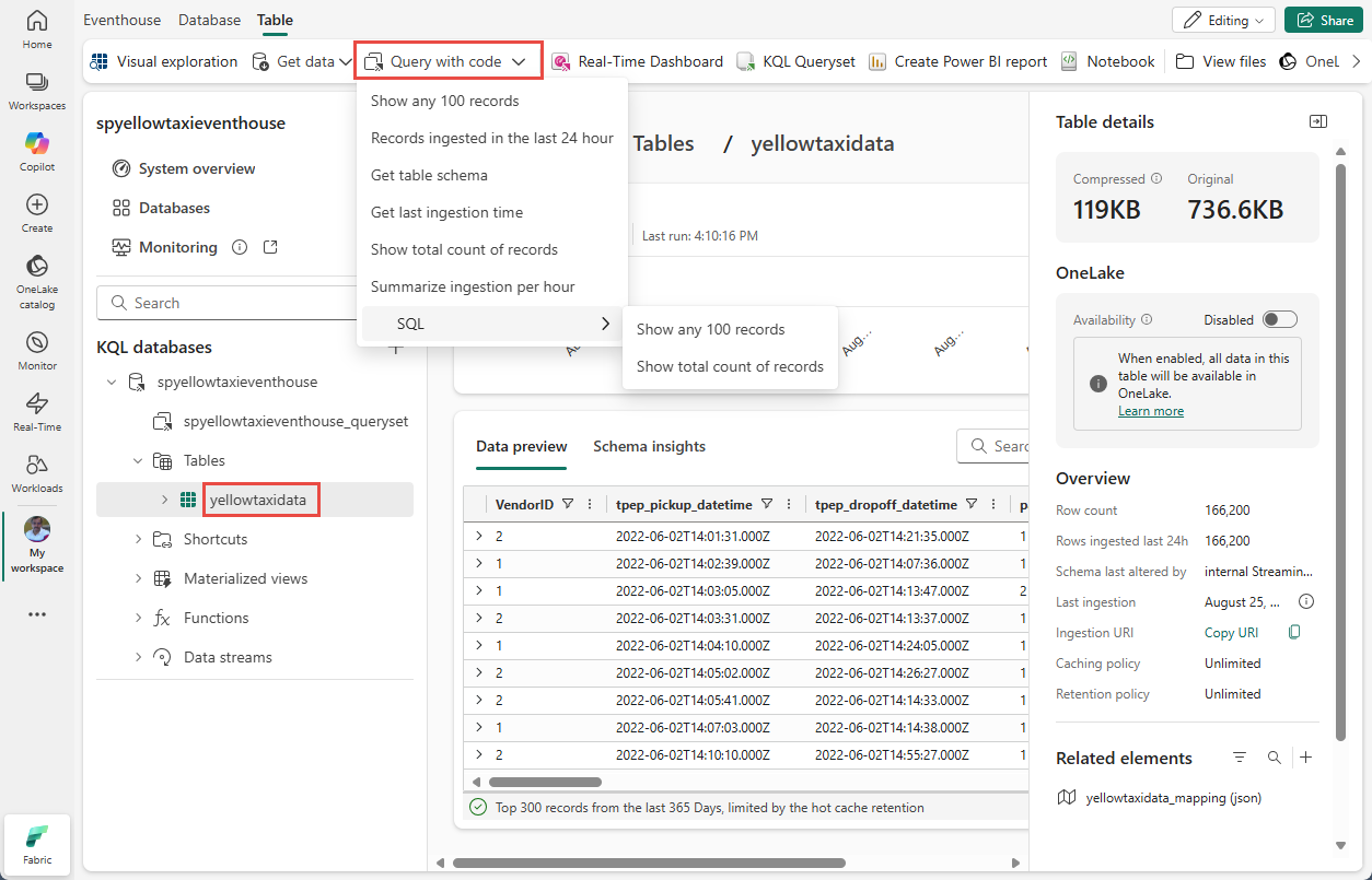 เลือกตารางในบานหน้าต่างด้านซ้าย ในตัวอย่างต่อไปนี้ yelllowtaxidata ถูกเลือก