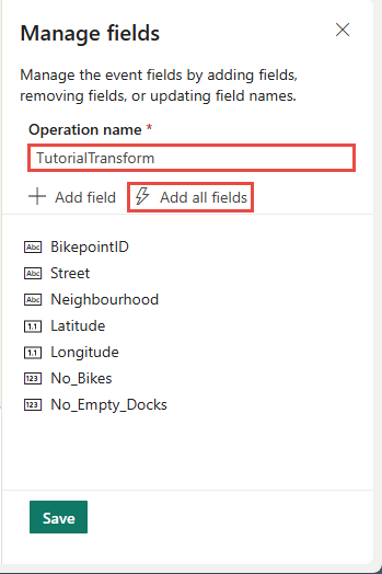 ยืนยันว่า Timestamp ถูกเพิ่มในรายการเขตข้อมูล และเลือกบันทึก ไทล์ TutorialTransform แสดงข้อผิดพลาดเนื่องจากปลายทางยังไม่ได้กําหนดค่า